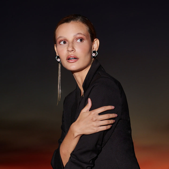 These handmade earrings are crafted from acrylic with glass rhinestones, a chain fringe, and gold metal detail. Small variations in color and finish are expected. Use a dry cotton cloth for cleaning and avoid contact with alcohol and perfumes.