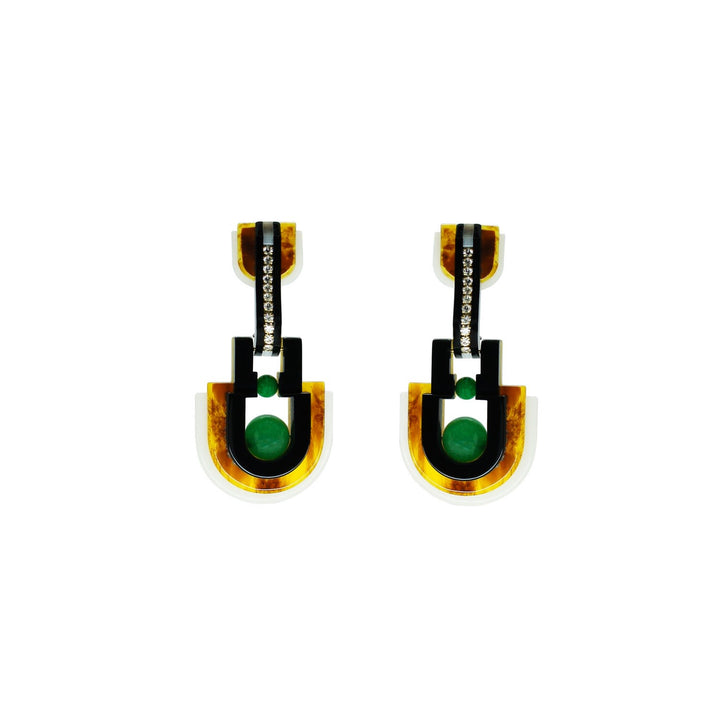 These handmade pendant earrings are crafted from acrylic with glass rhinestones and a dyed green Jade bead. The metals have a gold finish. Small variations in color and finish are expected. Use a dry cloth for cleaning and avoid contact with alcohol and perfumes.