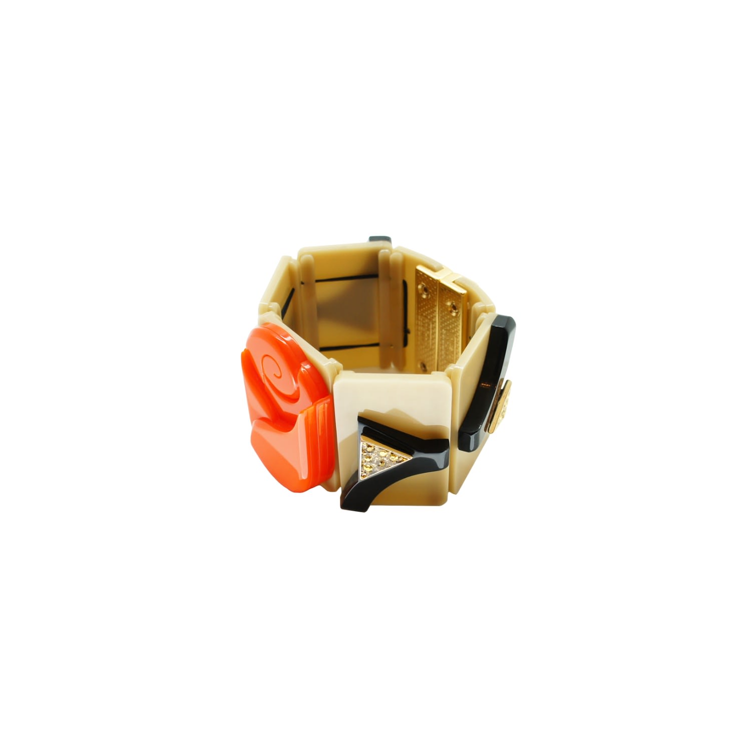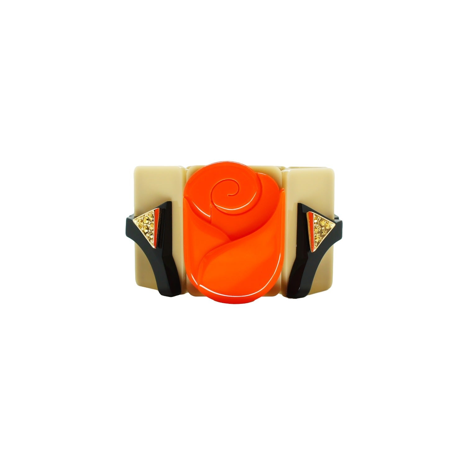 This Handmade Acrylic Bracelet Rose Kahki by Gissa Bicalho is an artistic and modern accessory. The articulated bracelet, which is crafted from acrylic, has a rose design with a magnetic clasp closure. The gold-finished metal ornament adds a touch of glamour. Its handcrafted nature ensures that each piece is slightly unique.
