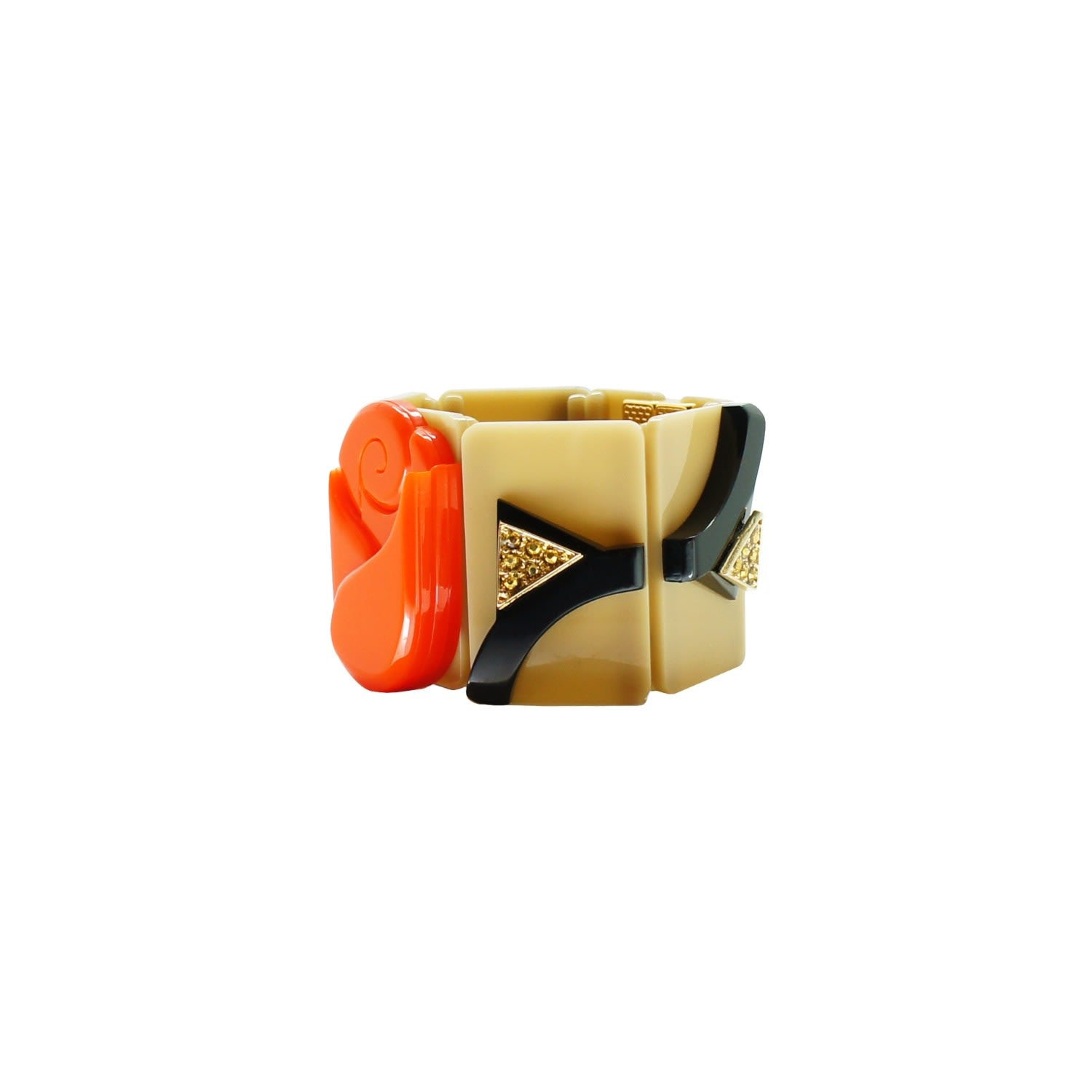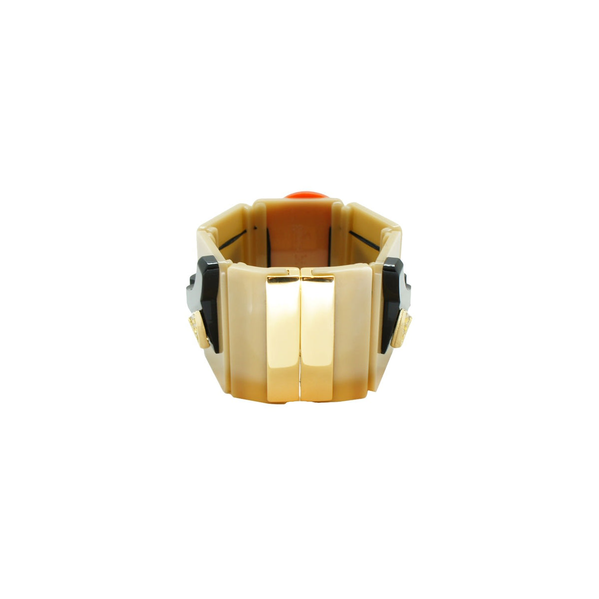 This bracelet is crafted from acrylic with a gold-finished metal ornament and a magnetic clasp. Small variations in color and finish are expected. Use a dry cloth for cleaning and avoid contact with alcohol and perfumes.