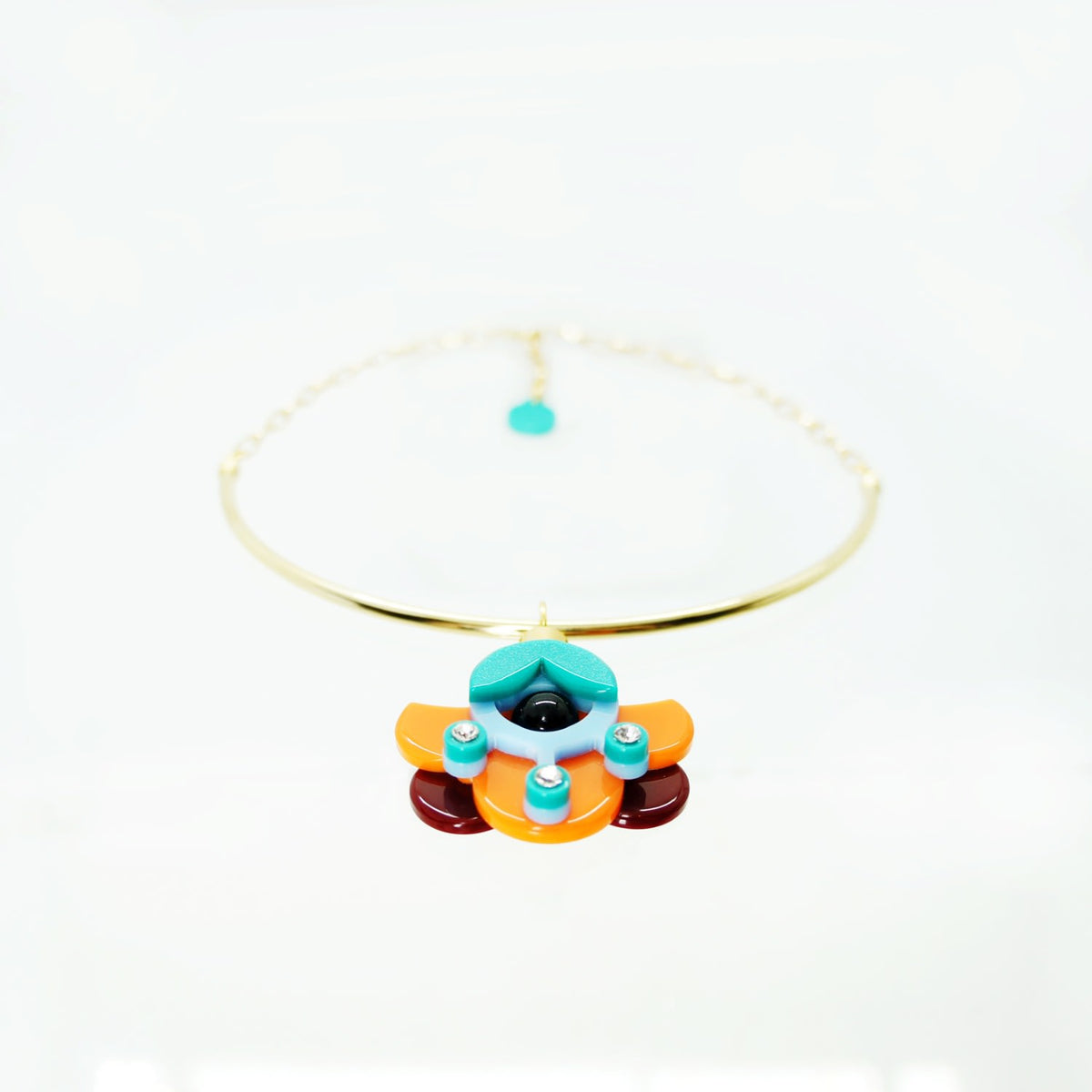 This Acrylic Handmade Necklace Choker Petunia Orange by Gissa Bicalho is a vibrant and artistic accessory. The necklace is crafted from acrylic with a synthetic bead, glass rhinestones, a zamak stem, and a golden-finished brass chain. Its handcrafted nature ensures that each piece is slightly unique, adding a personal and one-of-a-kind touch to your style.
