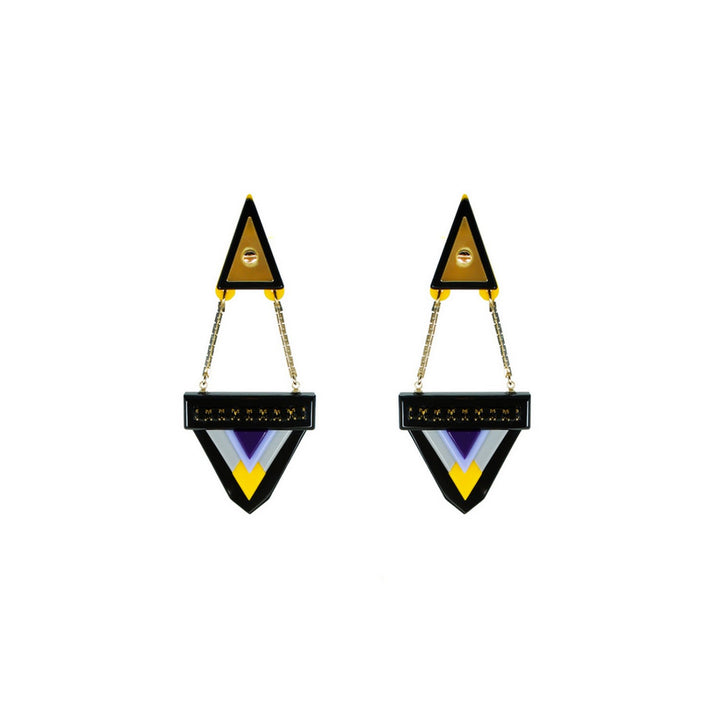 These Handmade Acrylic Earring Kuntur Yellow by Gissa Bicalho are a unique and artistic accessory. The acrylic pendant earrings feature a design with glass rhinestones, a golden metal ornament, and a chain. The vibrant yellow color adds a bold and creative touch. Its handcrafted nature ensures that each piece is slightly unique.