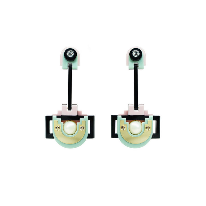 These handmade pendant earrings are crafted from acrylic with a gold-finished metal ornament, a shell pearl, and glass rhinestones. Small variations in color and finish are expected. Use a dry cotton cloth for cleaning and avoid contact with alcohol and perfumes.