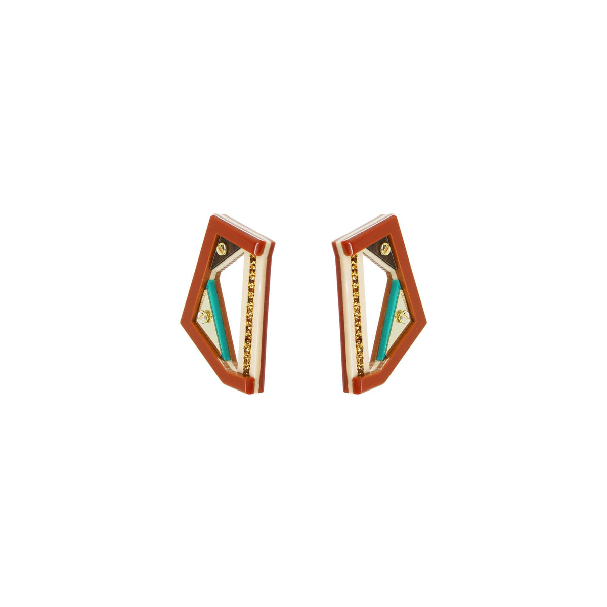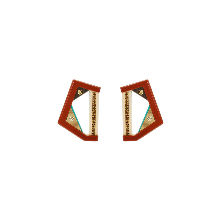 These handmade stud earrings are crafted from acrylic with glass rhinestones, a formica and filigree application, and golden-finished metals. They are secured with a stainless steel pin. Small variations in color and finish are expected. Use a dry cloth for cleaning and avoid contact with alcohol and perfumes.