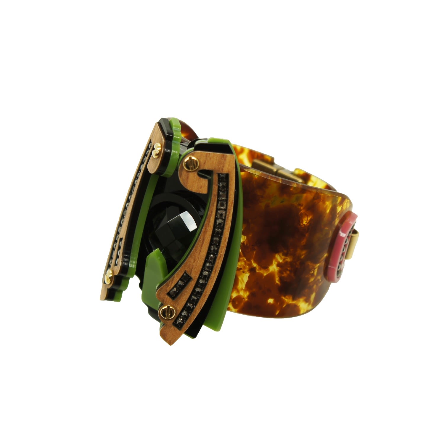 This bangle is crafted from acrylic with a glass stone and glass rhinestones. The metals have a gold finish. Small variations in color and finish are expected. Use a dry cloth for cleaning and avoid contact with alcohol and perfumes.