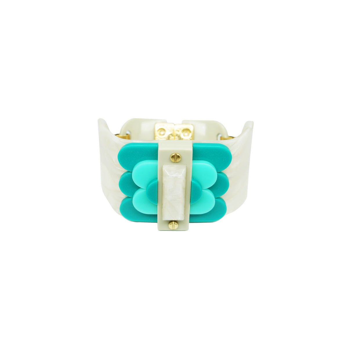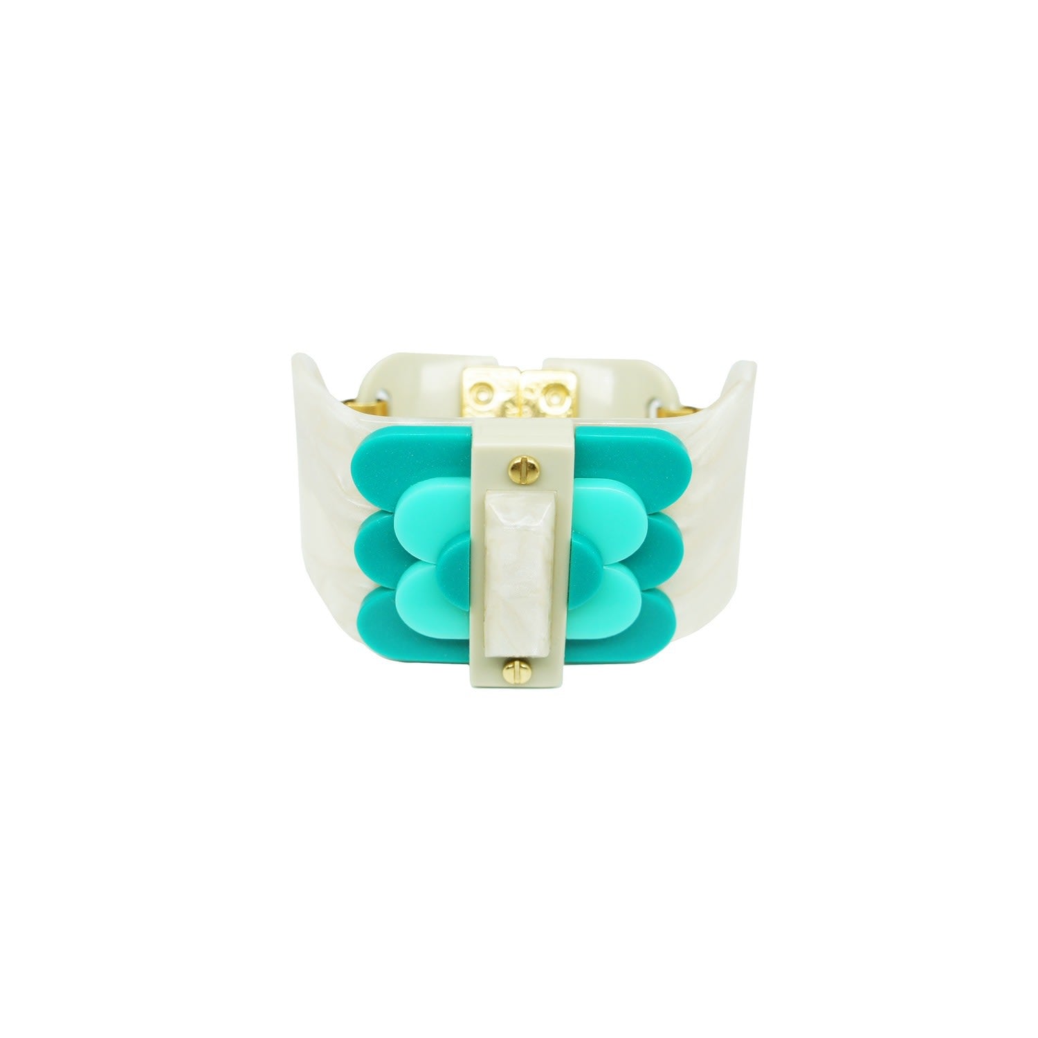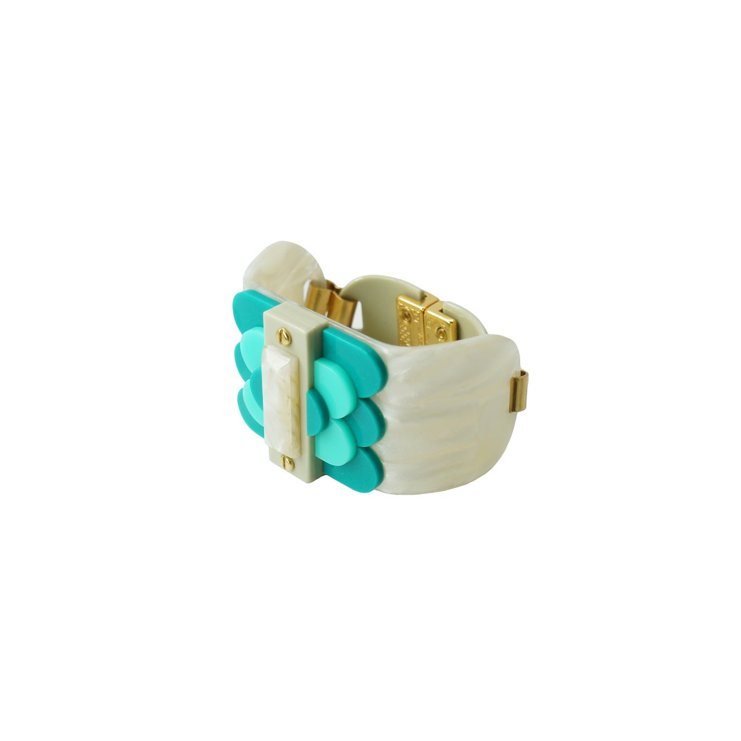 This Handmade Bracelet Scales Turquoise Green by Gissa Bicalho is a unique and artistic accessory. This bracelet, made of acrylic with a magnetic clasp closure, features a bold design and a vibrant turquoise green color. Its handcrafted nature ensures each piece is slightly unique, adding a personal and one-of-a-kind touch to your style. It is available in sizes XS, S, M, and L.