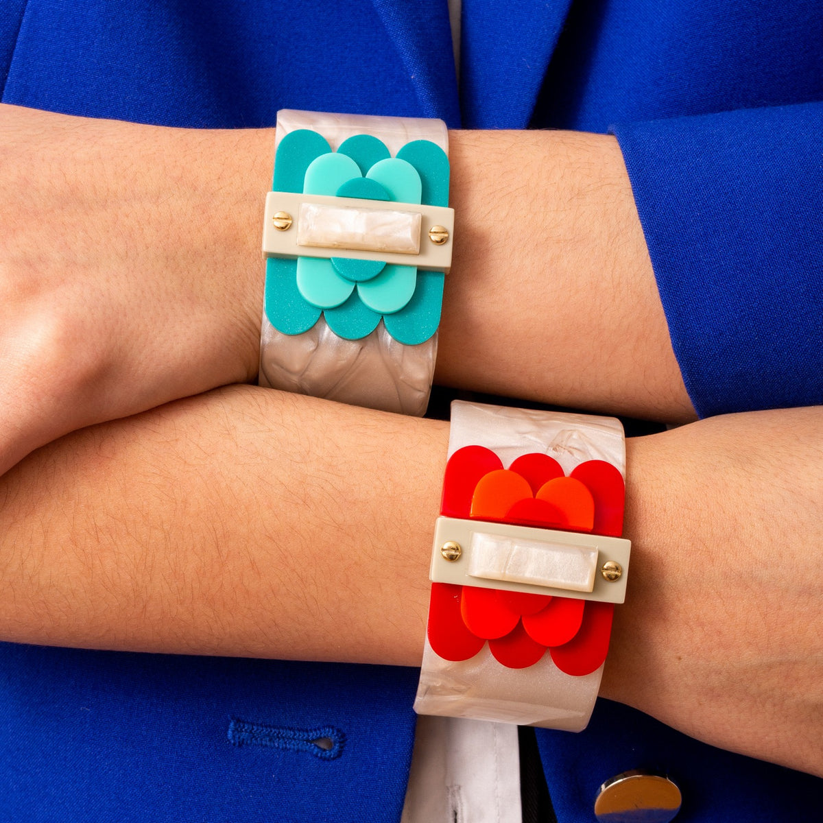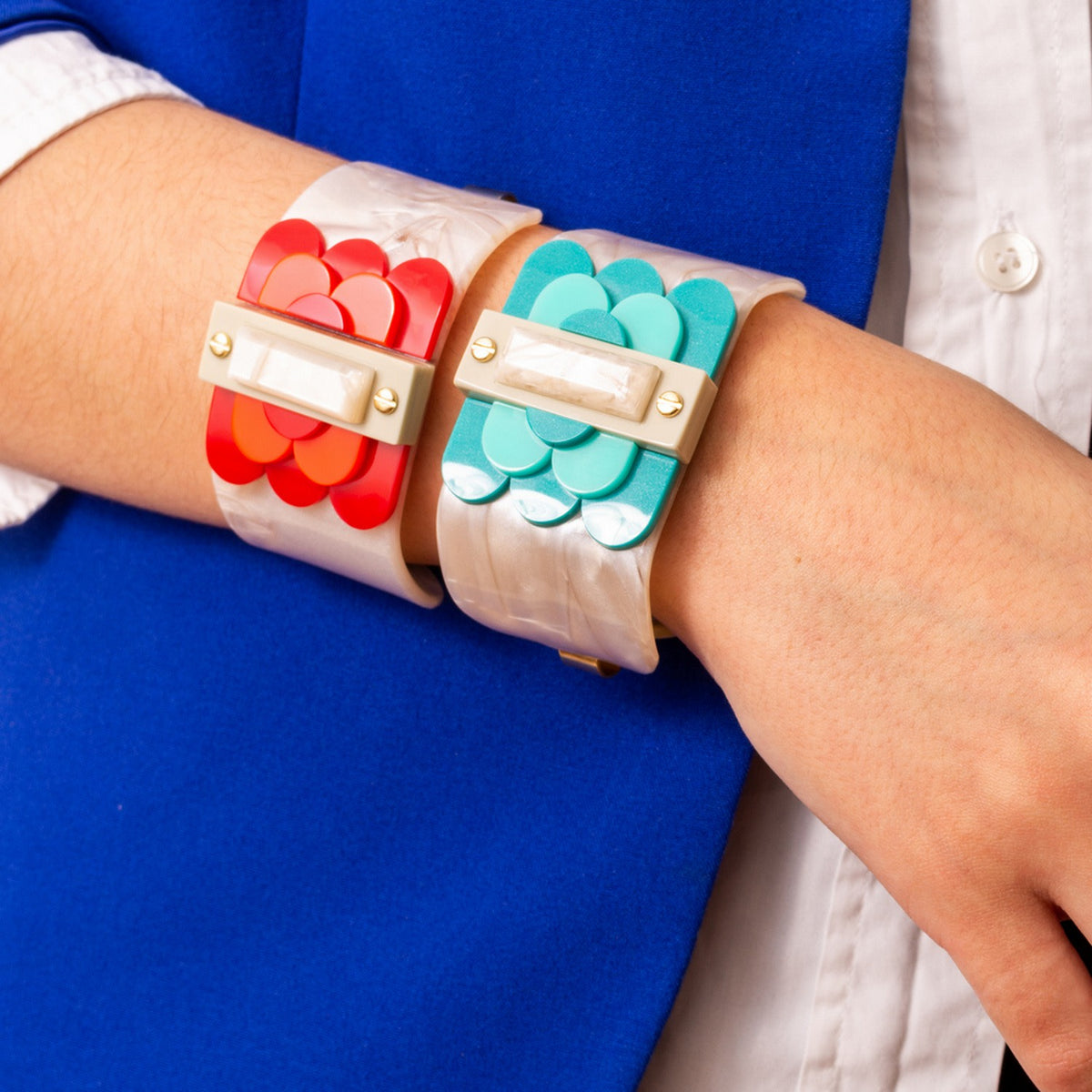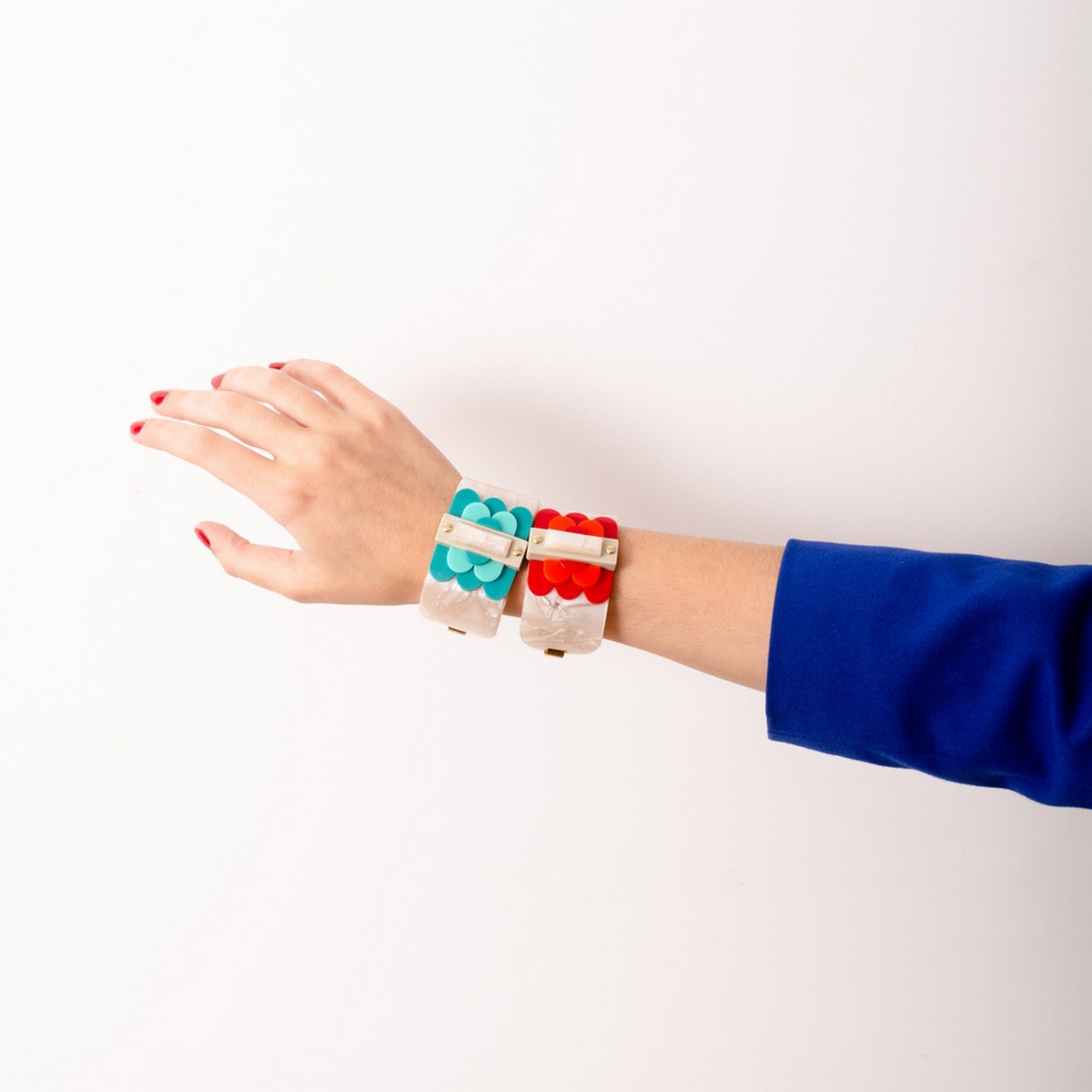 This Handmade Bracelet Scales Turquoise Green by Gissa Bicalho is a unique and artistic accessory. This bracelet, made of acrylic with a magnetic clasp closure, features a bold design and a vibrant turquoise green color. Its handcrafted nature ensures each piece is slightly unique, adding a personal and one-of-a-kind touch to your style. It is available in sizes XS, S, M, and L.