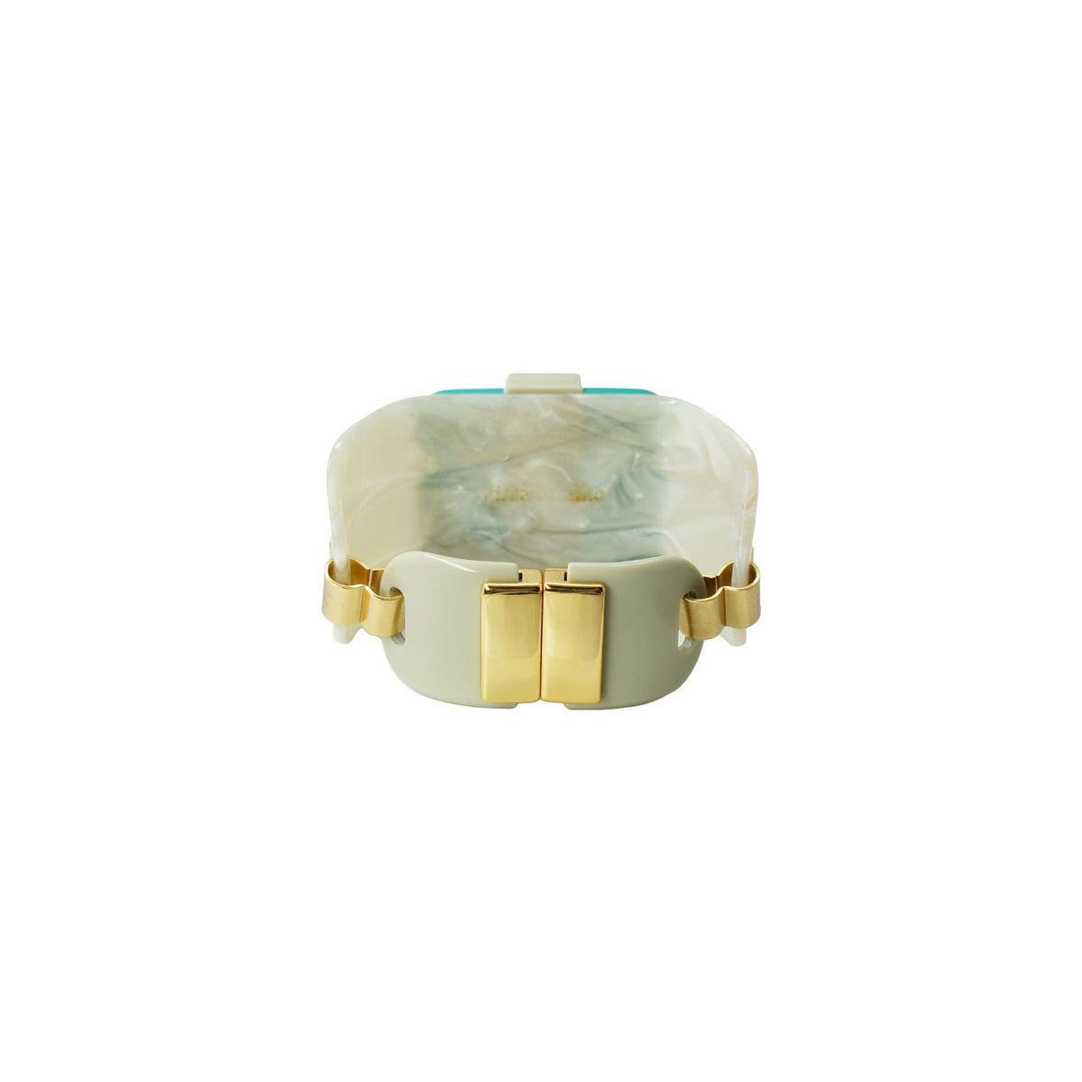 This bangle is crafted from acrylic with a magnetic clasp. The metals have a gold finish. It's available in sizes XS, S, M, and L. To maintain its quality, use a dry cloth for cleaning and avoid contact with alcohol and perfumes.