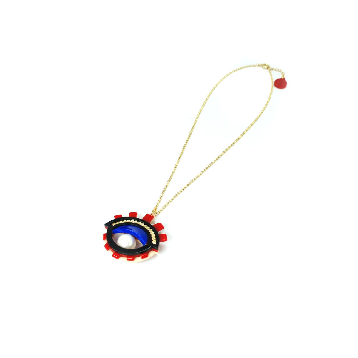 This necklace is crafted from acrylic with a chain and a shell pearl. The chain and metals have a golden finish. Small variations in color and finish are expected. Use a dry cloth for cleaning and avoid contact with alcohol and perfumes.