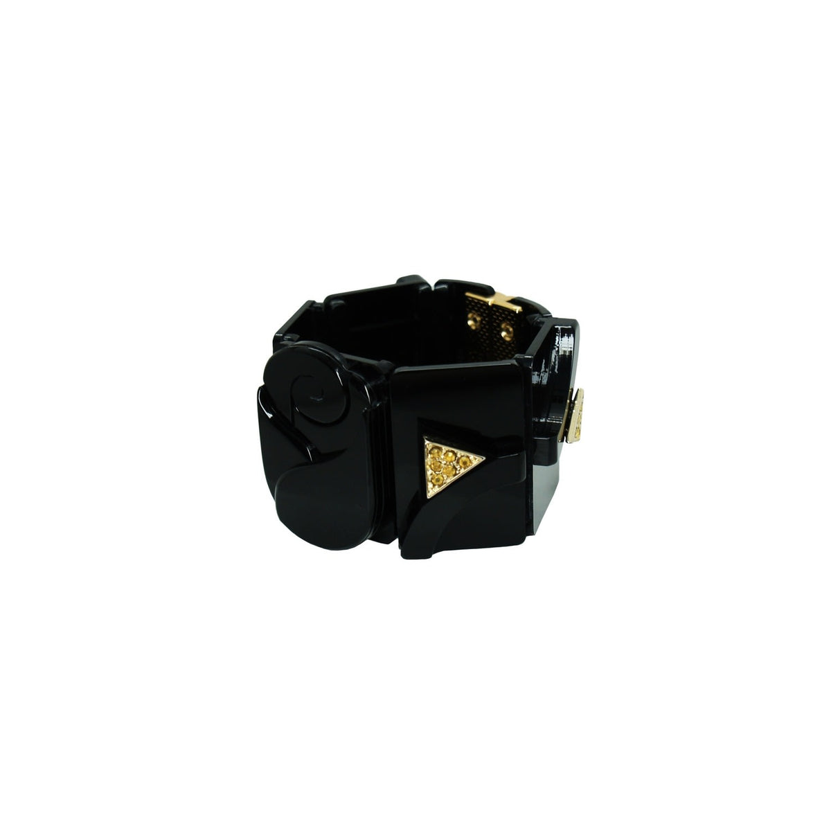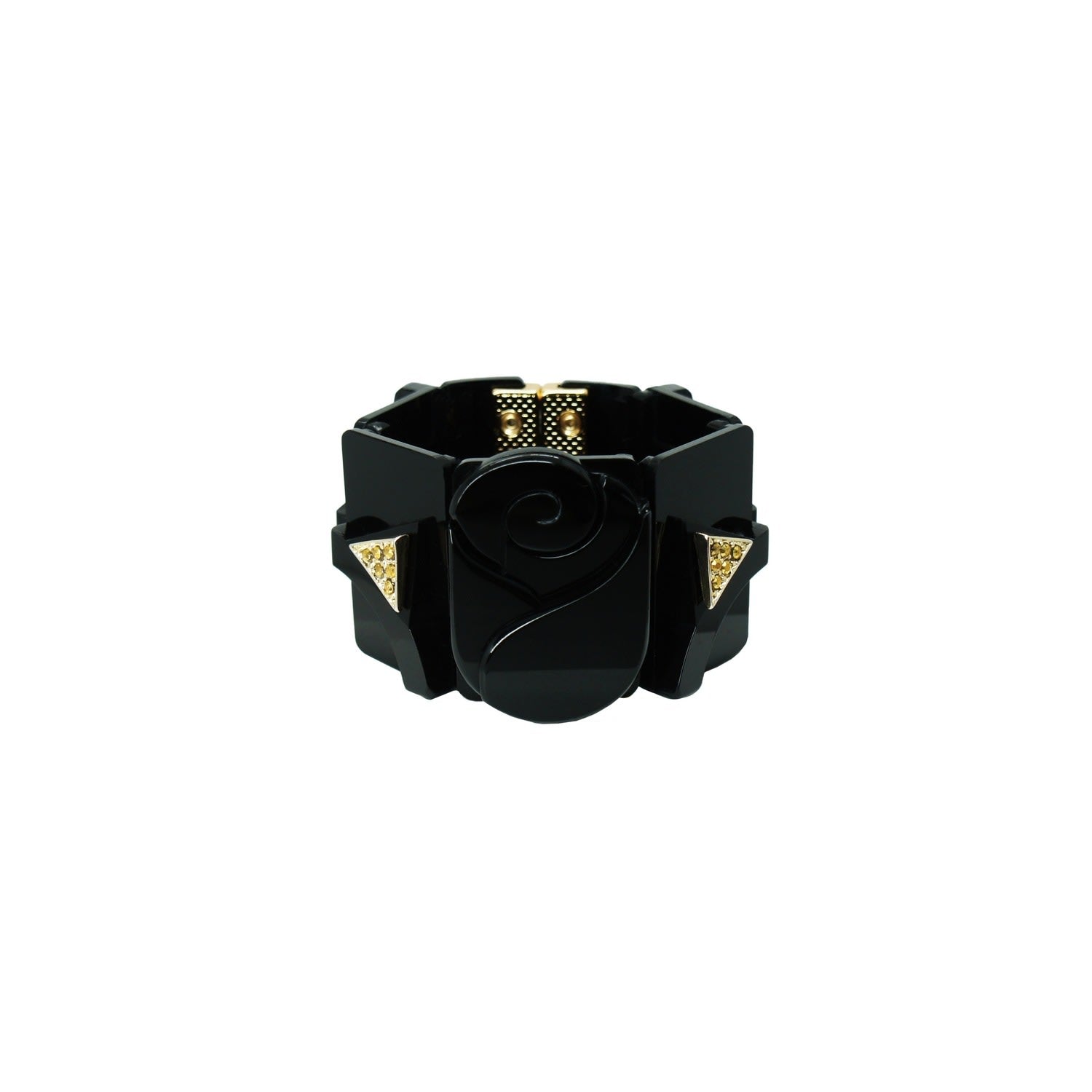 This cuff bracelet is crafted from acrylic with a metal ornament and a magnetic clasp. The metals have a gold finish. Small variations in color and finish are expected. Use a dry cloth for cleaning and avoid contact with alcohol and perfumes.