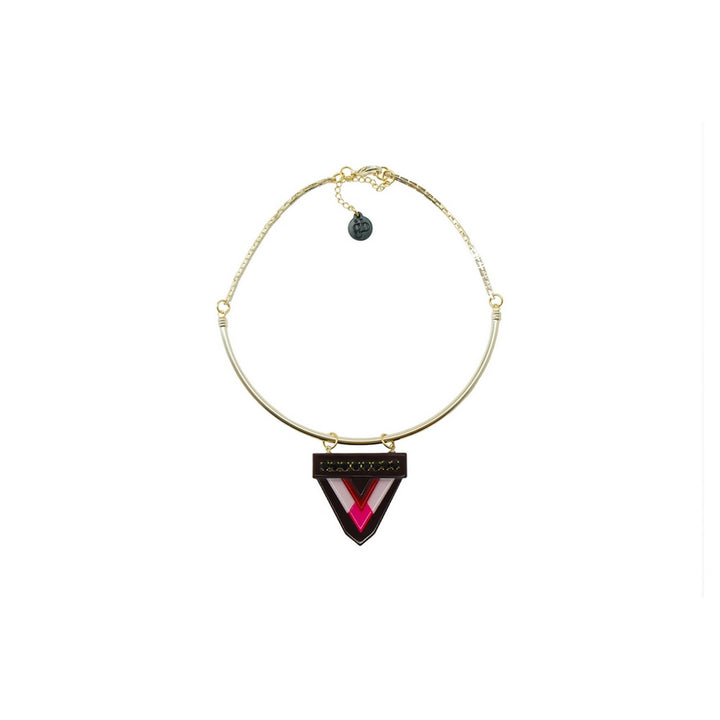 This handmade pendant necklace is crafted from acrylic with glass rhinestones, a half metal ring, and a chain fringe. The metals have a gold finish. Small variations in color and finish are expected. Use a dry cloth for cleaning and avoid contact with alcohol and perfumes.
