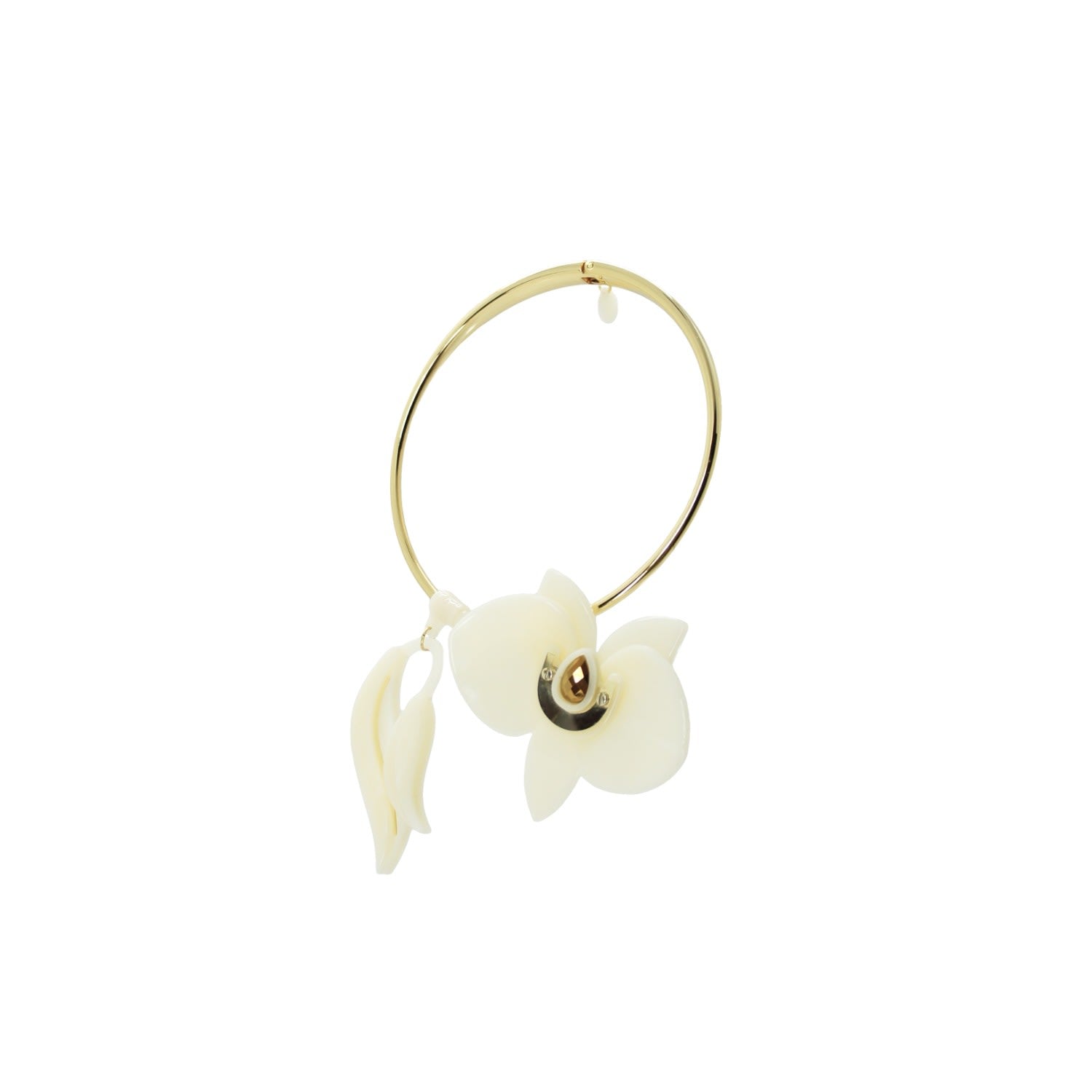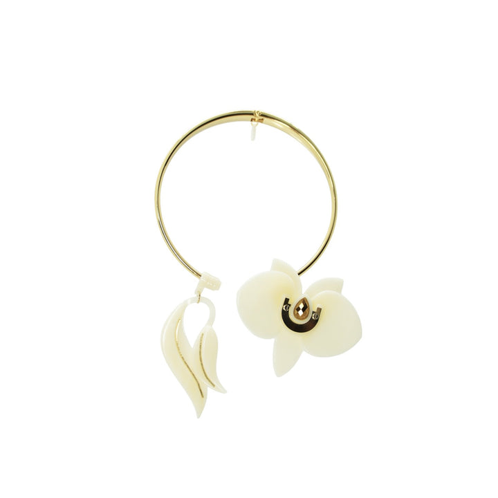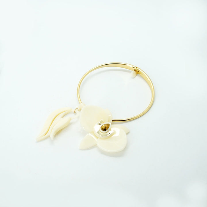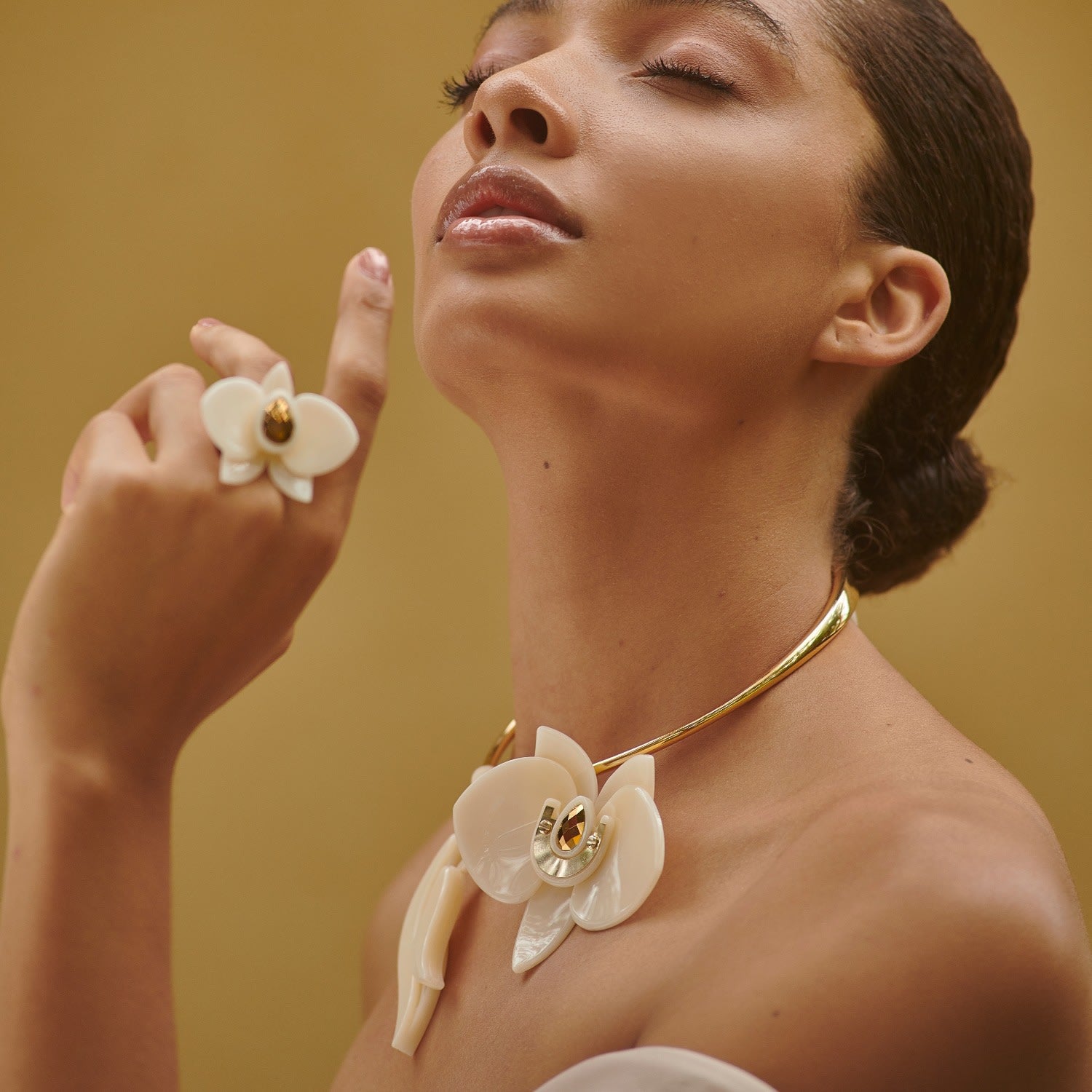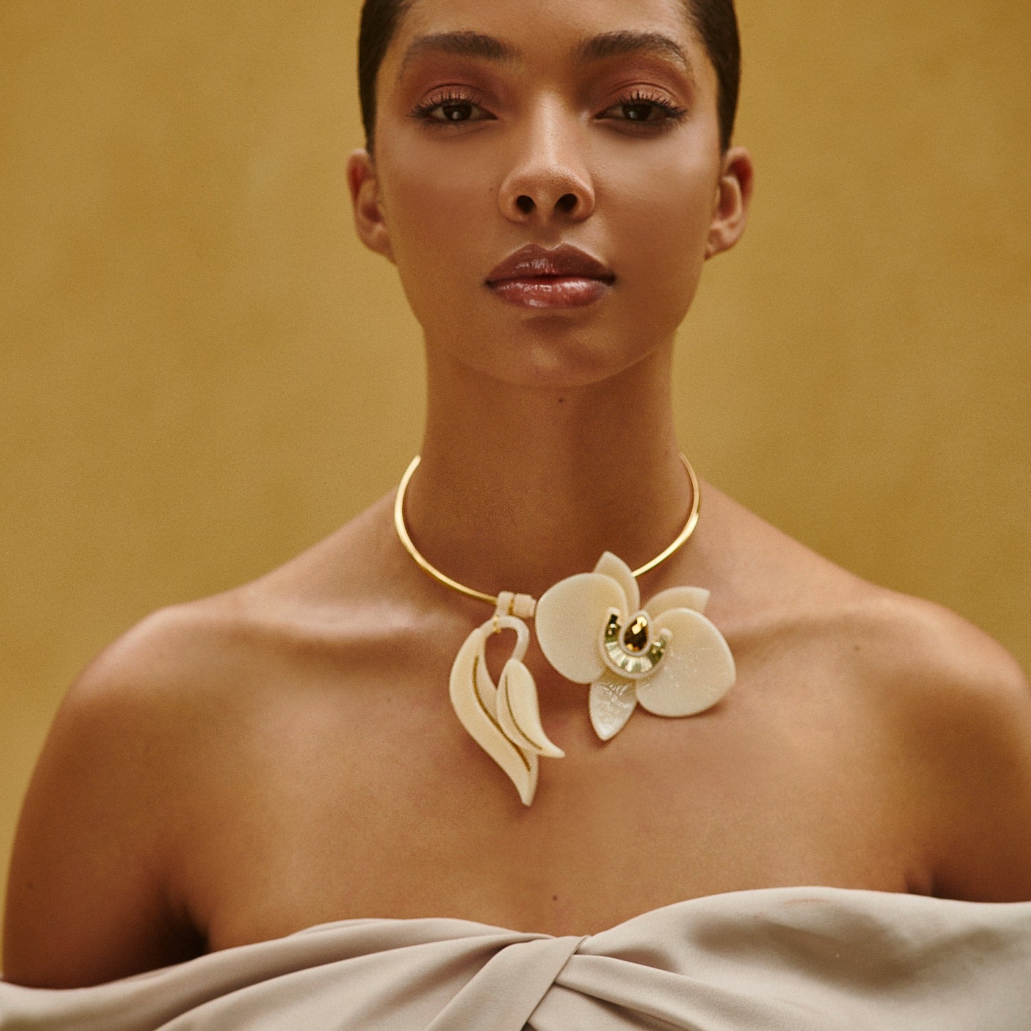 This Acrylic Handmade Necklace Orchid Deco Cream by Gissa Bicalho is an artistic and modern accessory. The necklace, which has an acrylic pendant, a zamak stem, and a golden-finished brass chain with a filigree application, is a true statement piece. The mirrored glass stone adds a touch of glamour. Its handmade nature ensures that each piece is slightly unique.