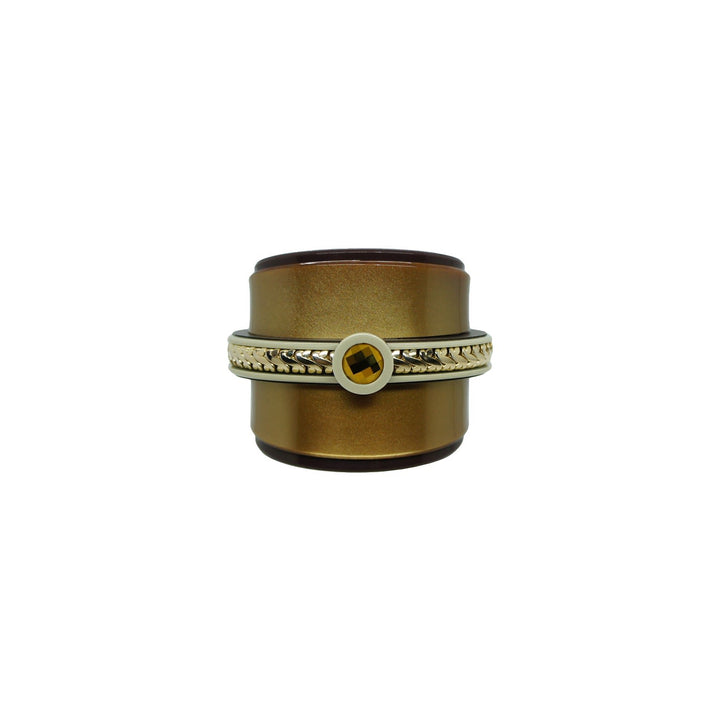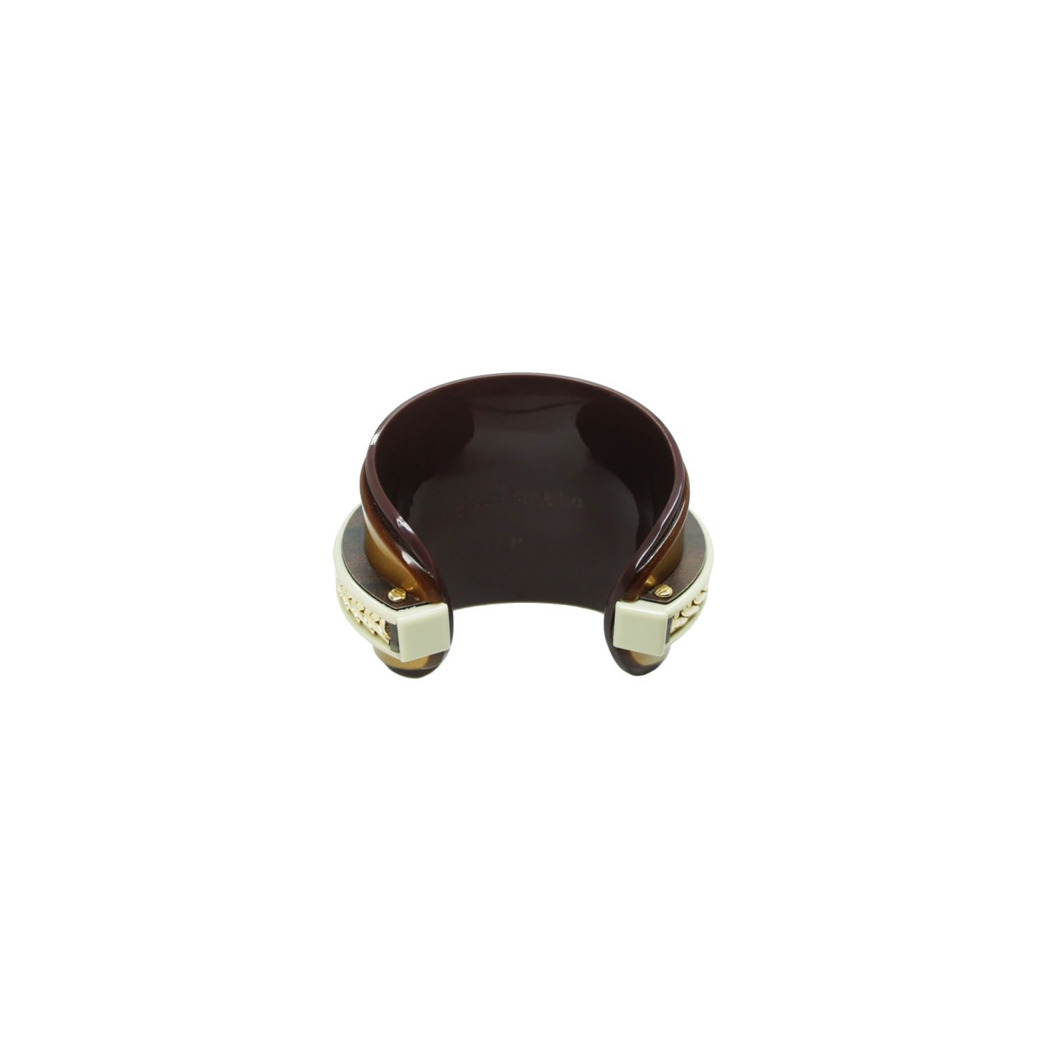 This handmade cuff bracelet is crafted from acrylic with a mirrored glass stone and a golden finished brass chain. Small variations in color and finish are expected. Use a dry cloth for cleaning and avoid contact with alcohol and perfumes.