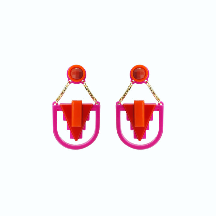 These handmade dangle earrings are crafted from acrylic with a glass stone and a chain. The metals have a gold finish. Small variations in color and finish are expected. Use a dry cloth for cleaning and avoid contact with alcohol and perfumes.