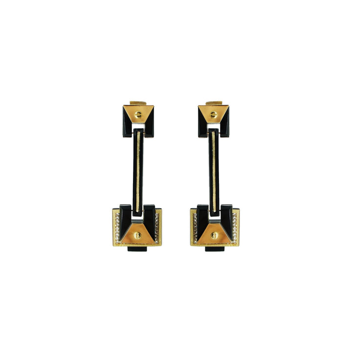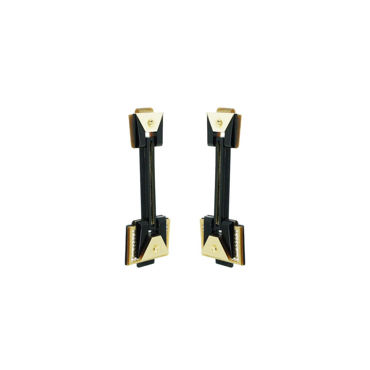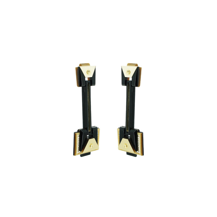 These Earring Long Trapeze Black by Gissa Bicalho are a unique and artistic accessory. The long articulated earrings feature glass rhinestones, filigree, and a chain. The handcrafted nature ensures each piece is slightly unique, adding a personal and one-of-a-kind touch to your style.