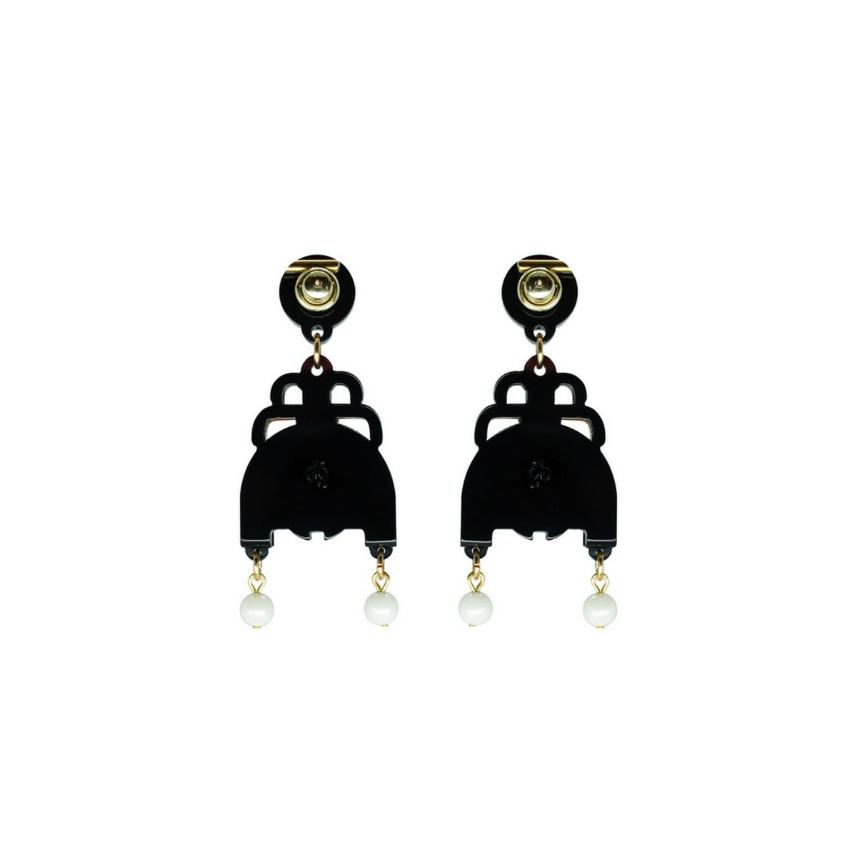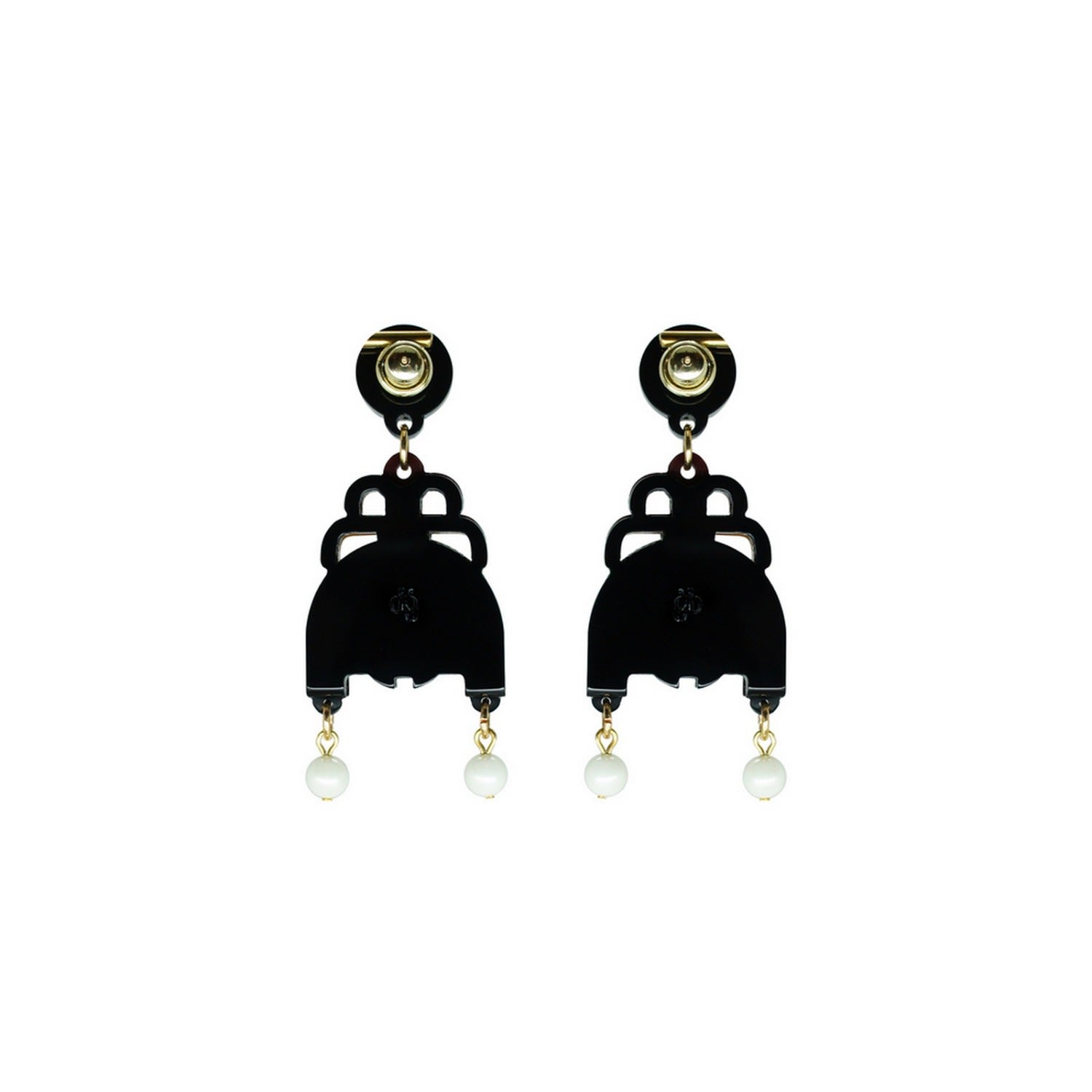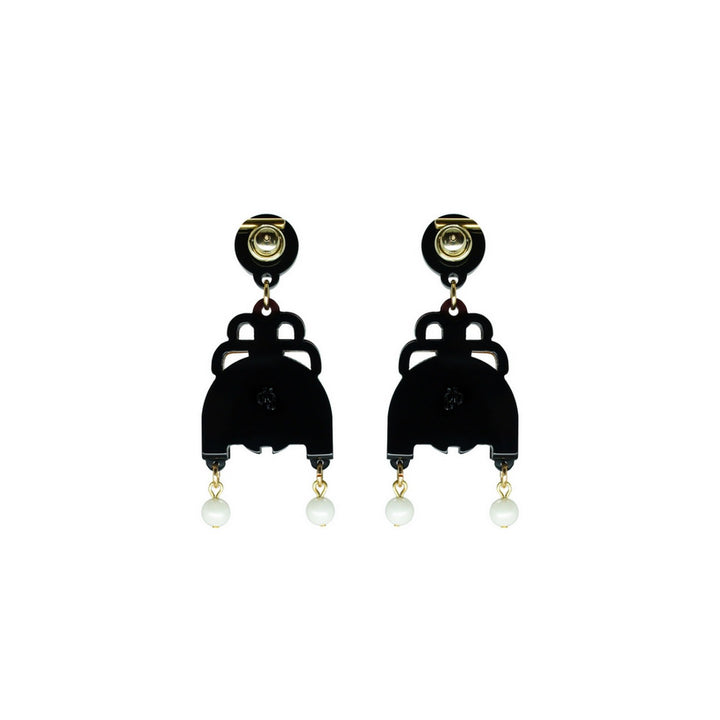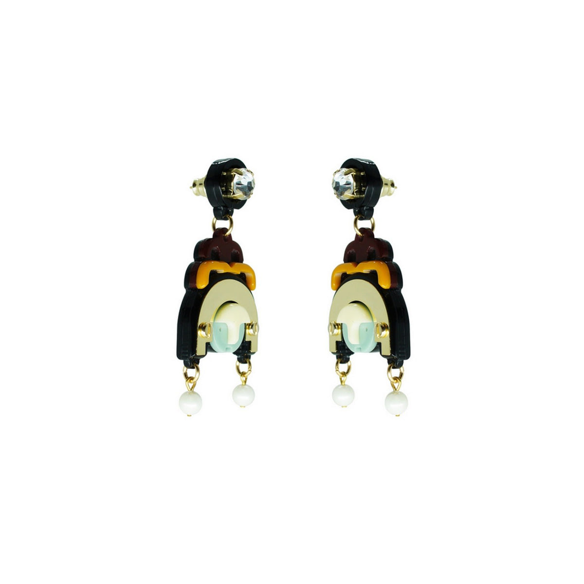 These handmade dangle earrings are crafted from acrylic with glass rhinestones, a shell pearl, and golden metal details. Small variations in color and finish are expected. Use a dry cotton cloth for cleaning and avoid contact with alcohol and perfumes.