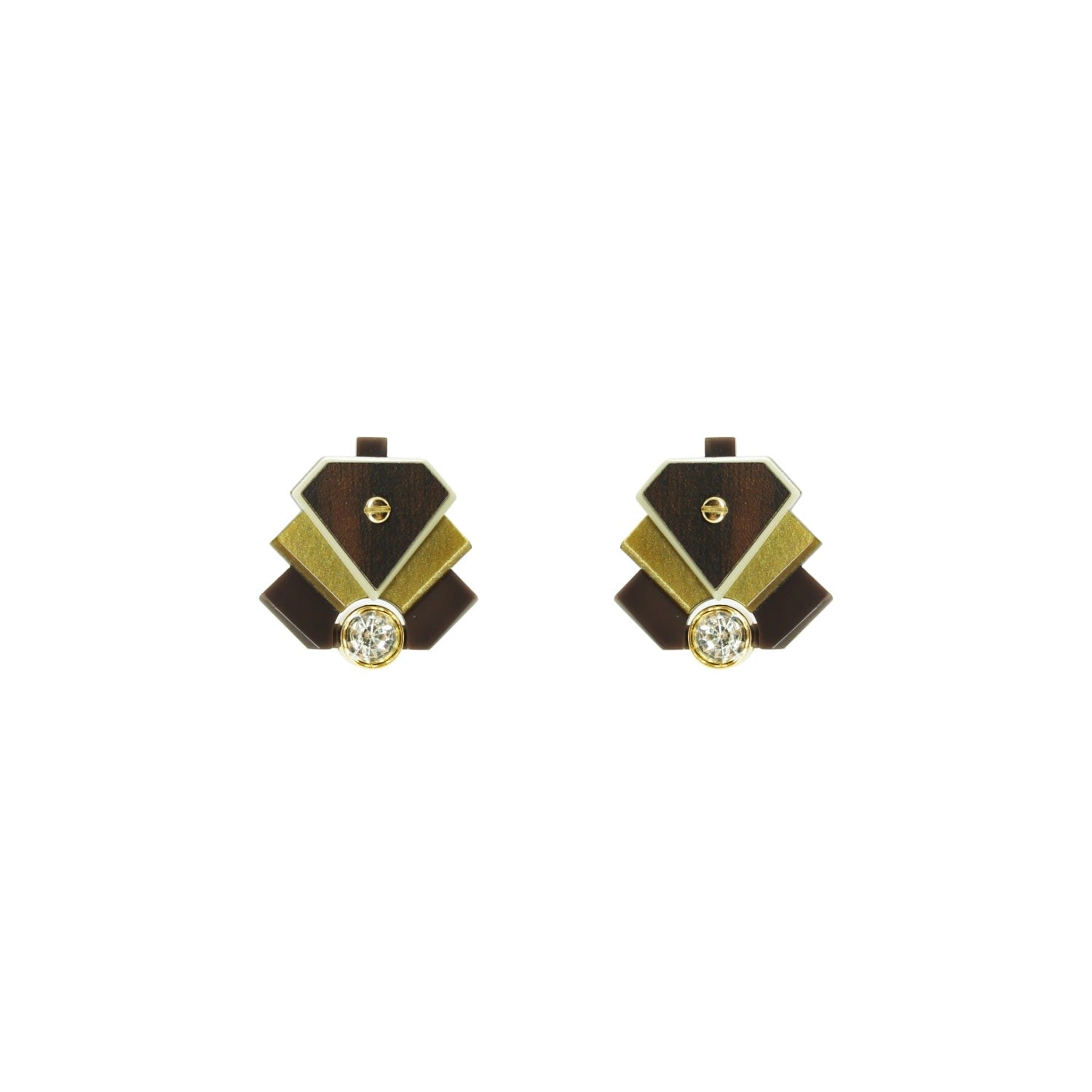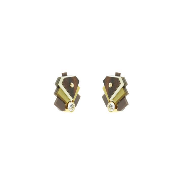 These handmade stud earrings are crafted from acrylic with a formica application, glass rhinestones, and zamak metal. The metals have a golden finish and a stainless steel pin. Small variations in color and finish are expected. Use a dry cloth for cleaning and avoid contact with alcohol and perfumes.