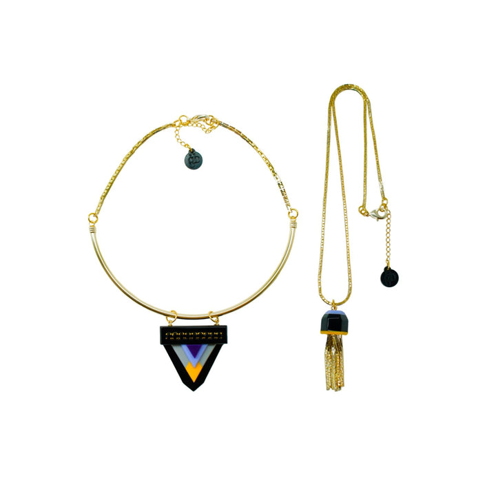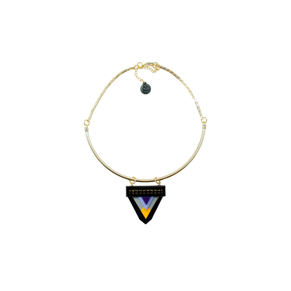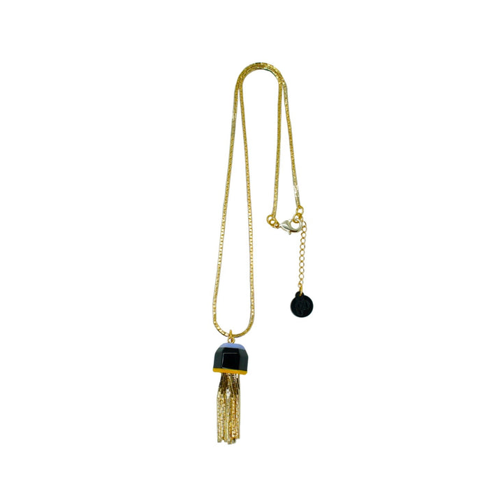 This handmade pendant necklace is crafted from acrylic with glass rhinestones, a half metal ring, and a chain fringe. The metals have a gold finish. Small variations in color and finish are expected. Use a dry cloth for cleaning and avoid contact with alcohol and perfumes.