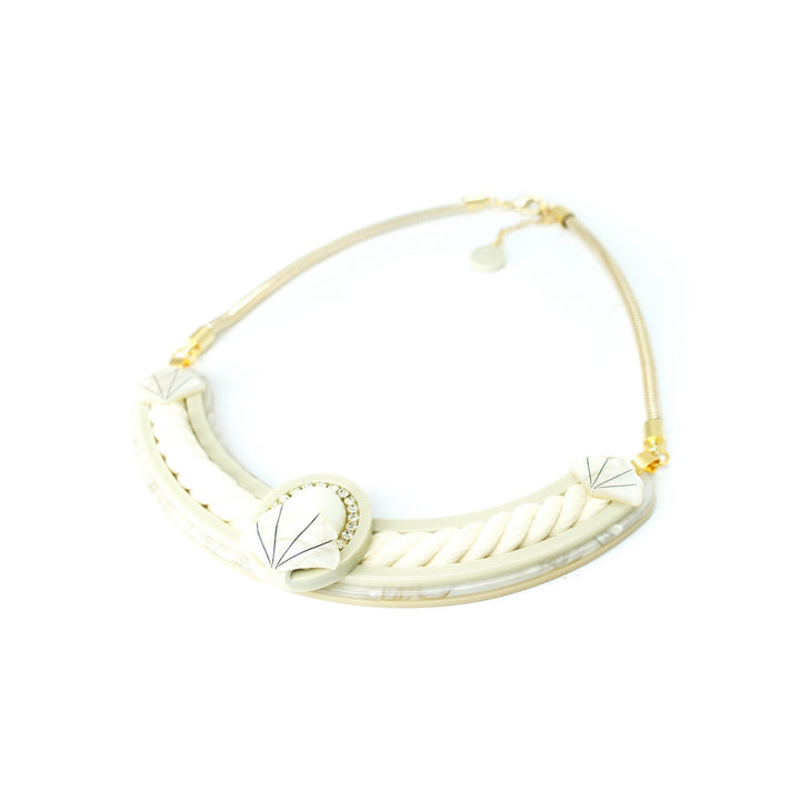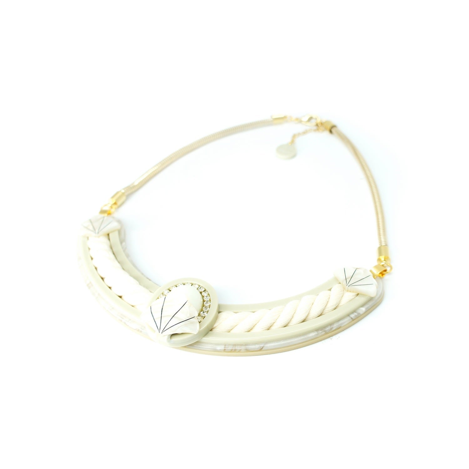 This handmade pearl necklace is crafted from acrylic with glass rhinestones, a cabochon pearl, and a braided cotton cord. The metals have a golden finish. Small variations in color and finish are expected. Use a dry cloth for cleaning and avoid contact with alcohol and perfumes.