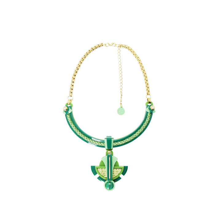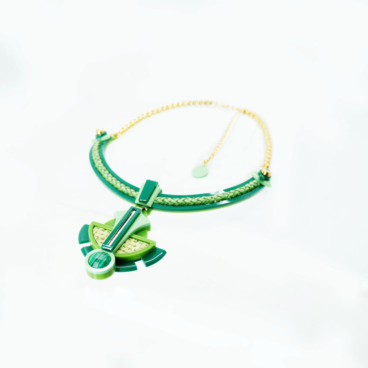 The Acrylic Handmade Necklace Buriti Green by Gissa Bicalho is a unique and artistic accessory. This necklace is made of acrylic and features a glass stone, glass rhinestones, and raffia straw. Its handcrafted nature ensures that each piece is slightly unique, adding a personal and one-of-a-kind touch to your style.