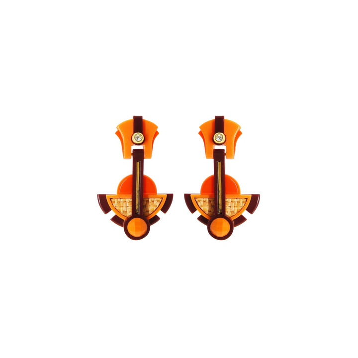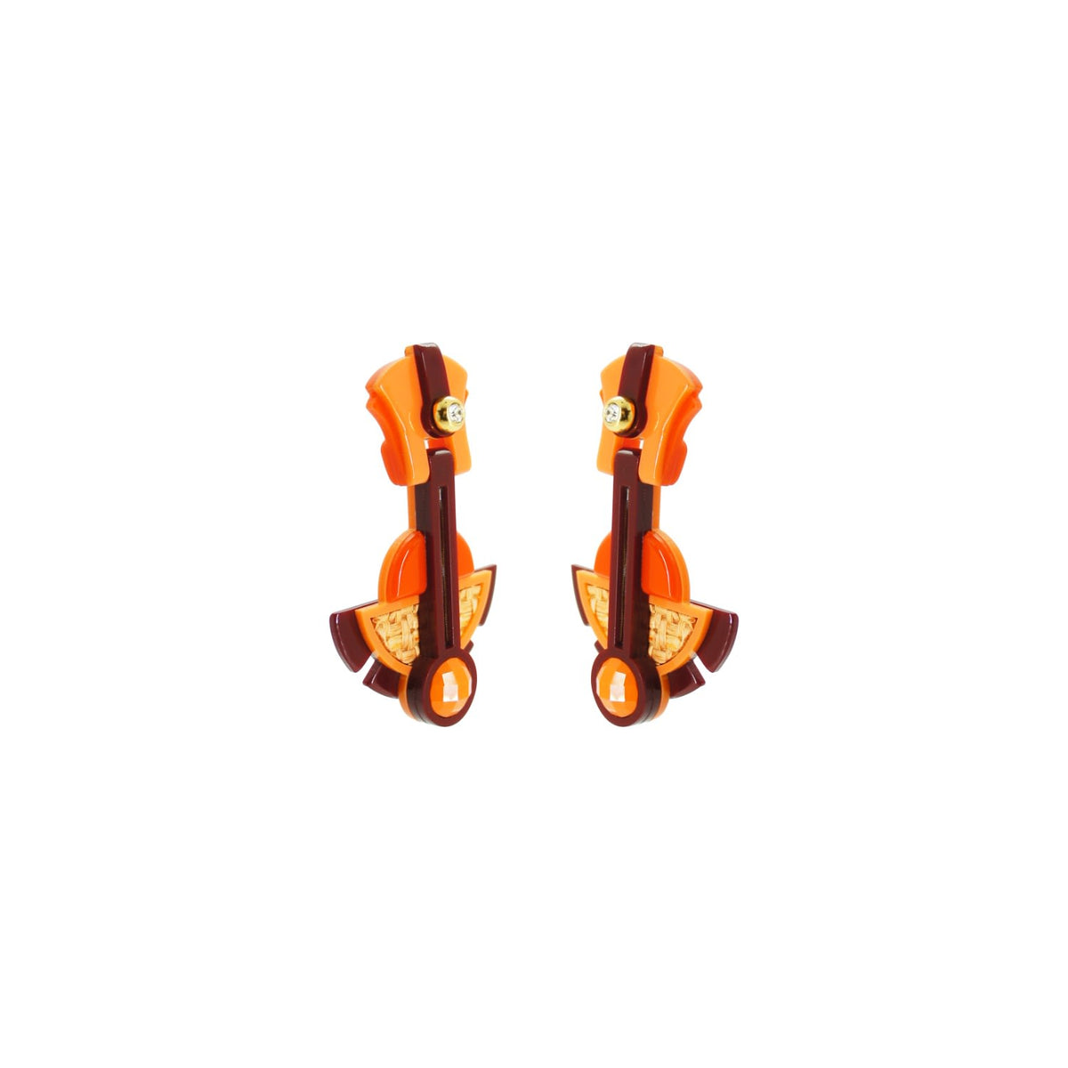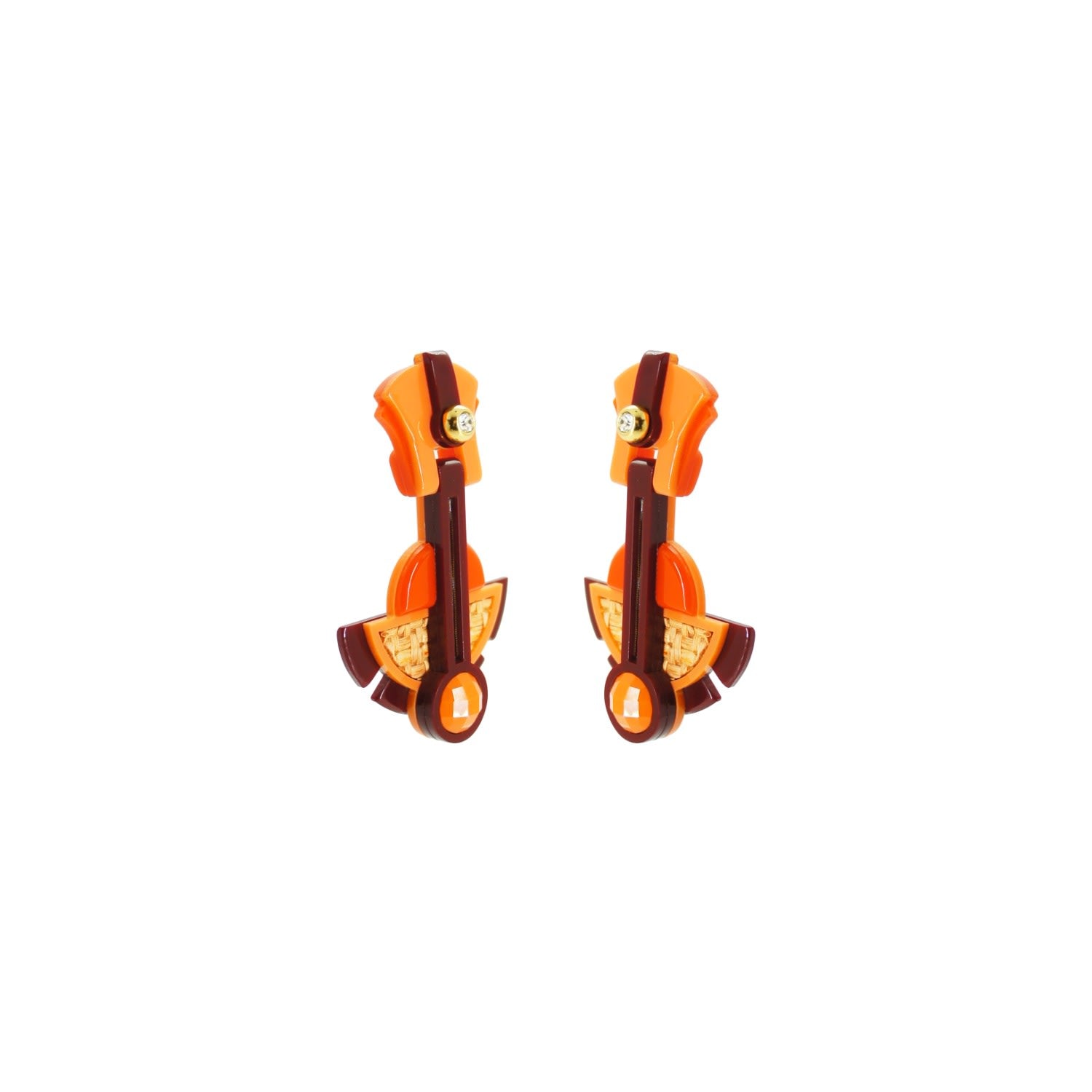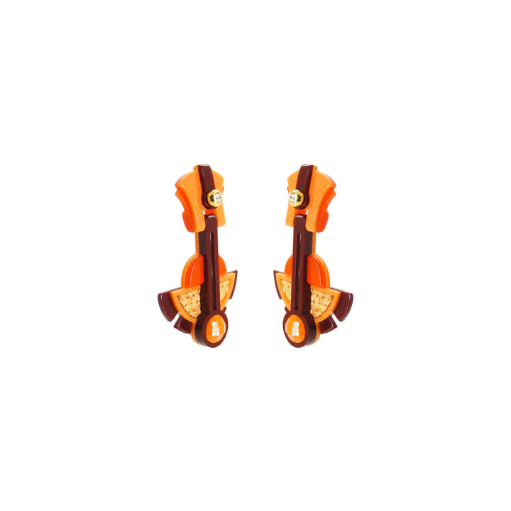 The Acrylic Handmade Earring Long Buriti Orange by Gissa Bicalho is a unique and artistic accessory. The earrings feature raffia straw, glass rhinestones, and a golden finished brass chain. The handcrafted nature ensures each piece is slightly unique, adding a personal and one-of-a-kind touch to your style.