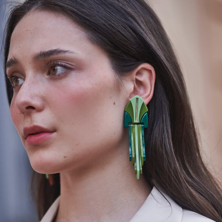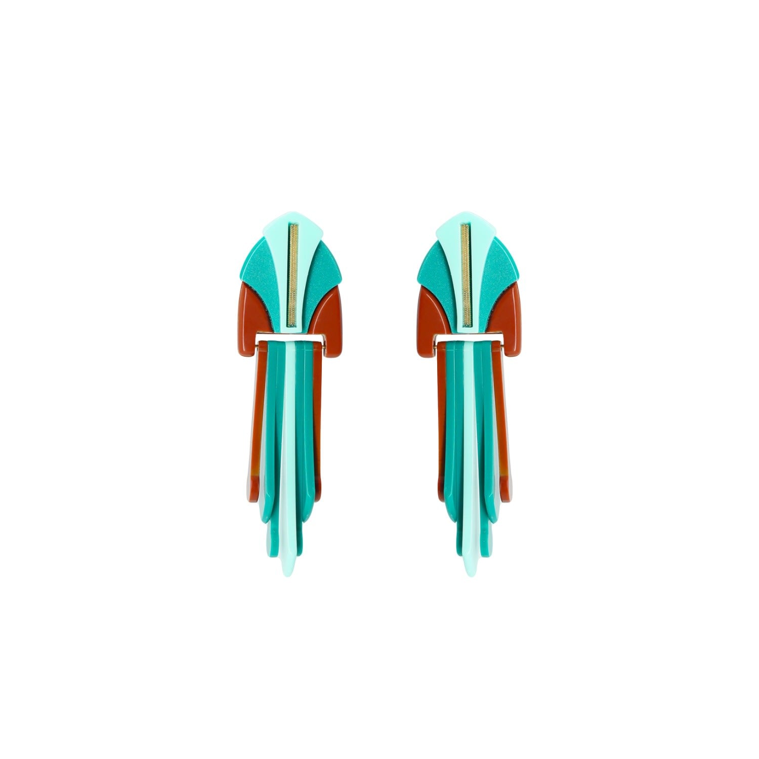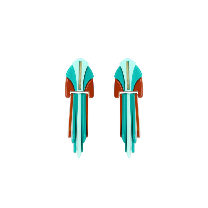 These handmade dangle earrings are crafted from acrylic and a chain. The earring pin and chain are made of brass. The metals have a gold finish. Small variations in color and finish are expected. Use a dry cloth for cleaning and avoid contact with alcohol and perfumes.