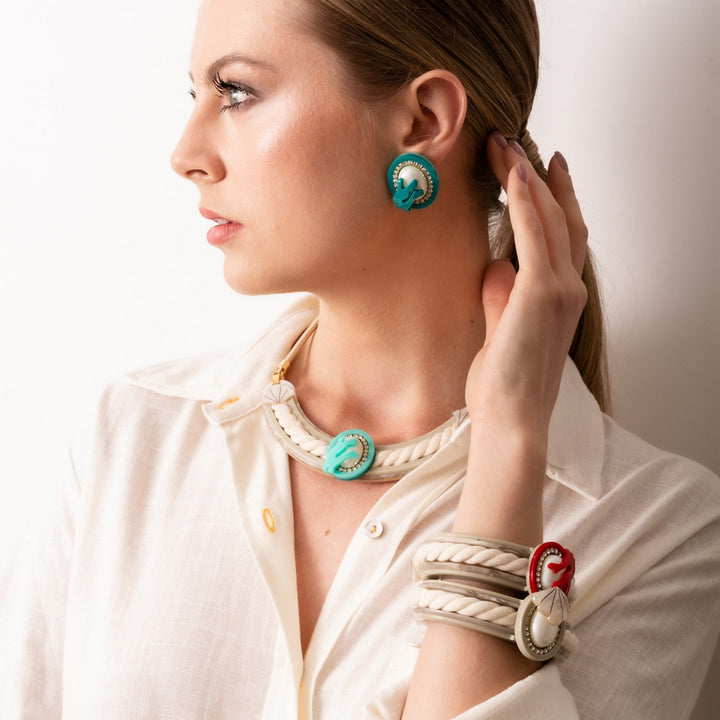 The Handmade Necklace Cord Coral And Pearl Light Pool by Gissa Bicalho is a unique and artistic accessory. This necklace is made of acrylic and features glass rhinestones, a cabochon pearl, and a braided cotton cord. Its handcrafted nature ensures that each piece is slightly unique, adding a personal and one-of-a-kind touch to your style.