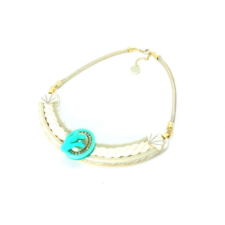 This handmade pearl necklace is crafted from acrylic with glass rhinestones, a cabochon pearl, and a braided cotton cord. The metals have a golden finish. Small variations in color and finish are expected. Use a dry cloth for cleaning and avoid contact with alcohol and perfumes.