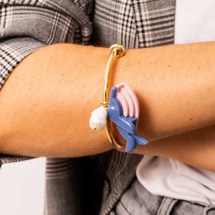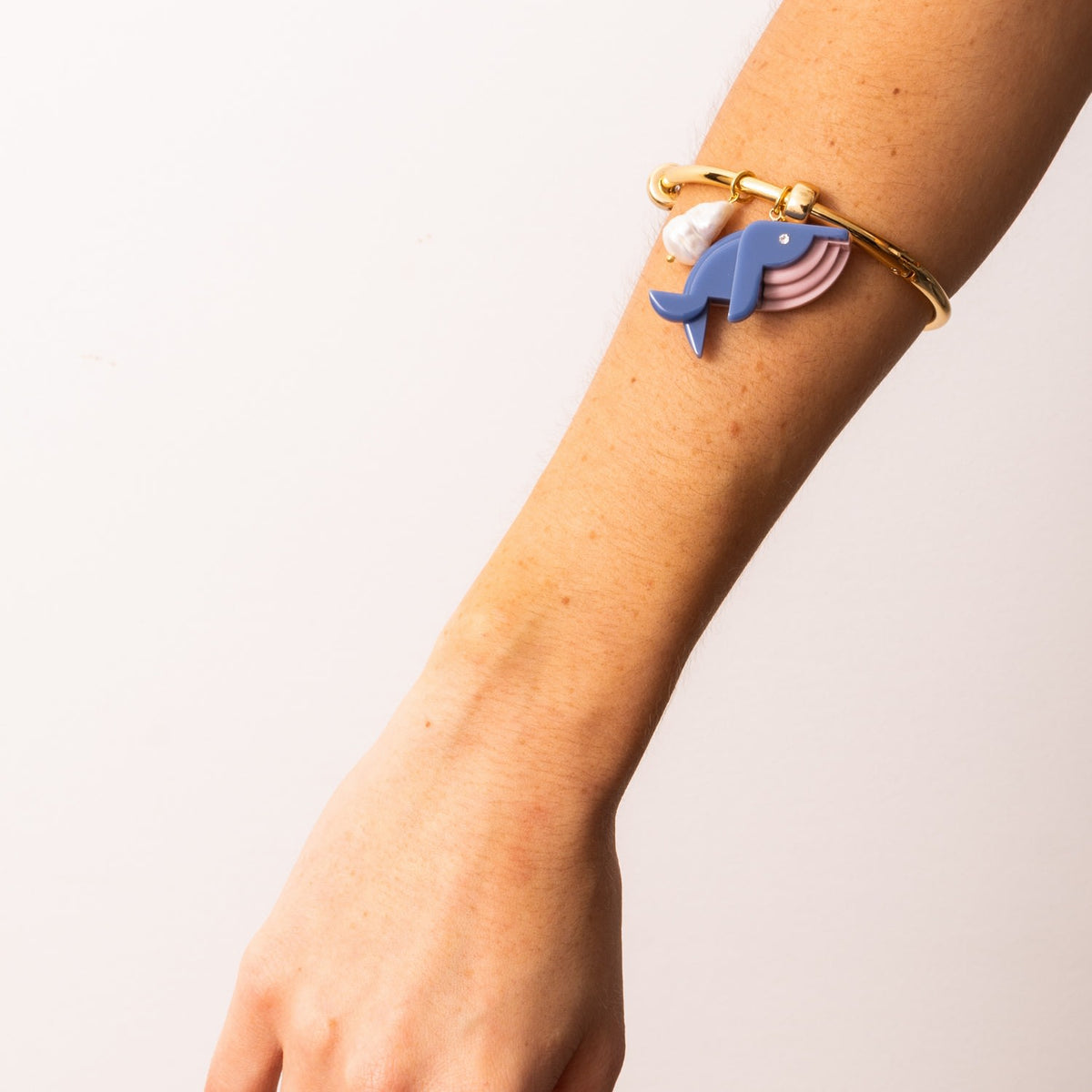 The Handmade Bracelet Whale Hortensia by Gissa Bicalho is a unique and artistic accessory. This bracelet is made of a metal hoop with an acrylic pendant. It also features glass rhinestones and a freshwater pearl (baroque pearl). Its handcrafted nature ensures that each piece is slightly unique, adding a personal and one-of-a-kind touch to your style.