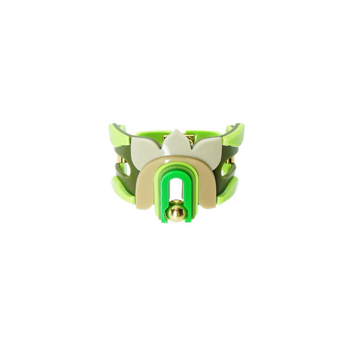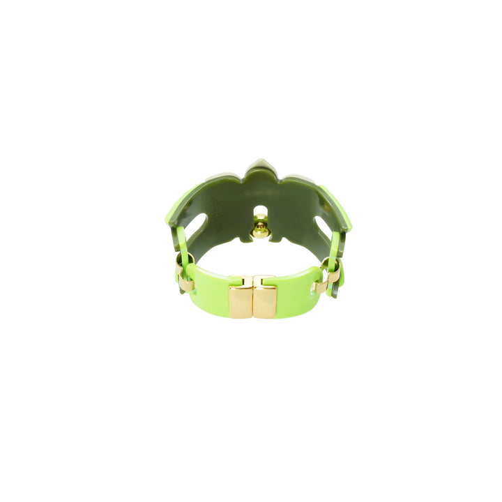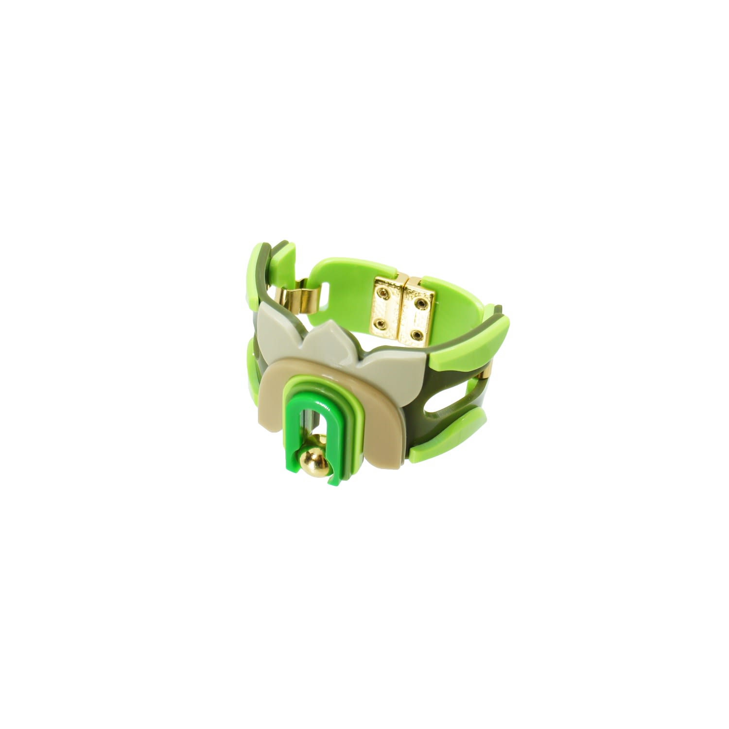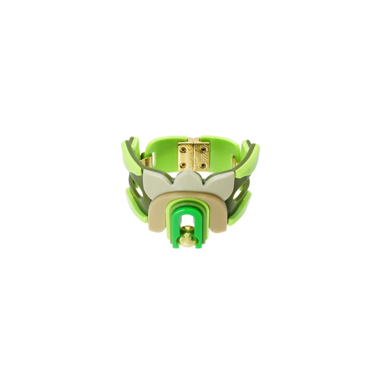 The Acrylic Handmade Bracelet Lilium Green by Gissa Bicalho is a unique and artistic accessory. This articulated bracelet is made of acrylic and features an ABS bead and zamak pieces. It is handmade by Brazilian artists and has a magnetic clasp.