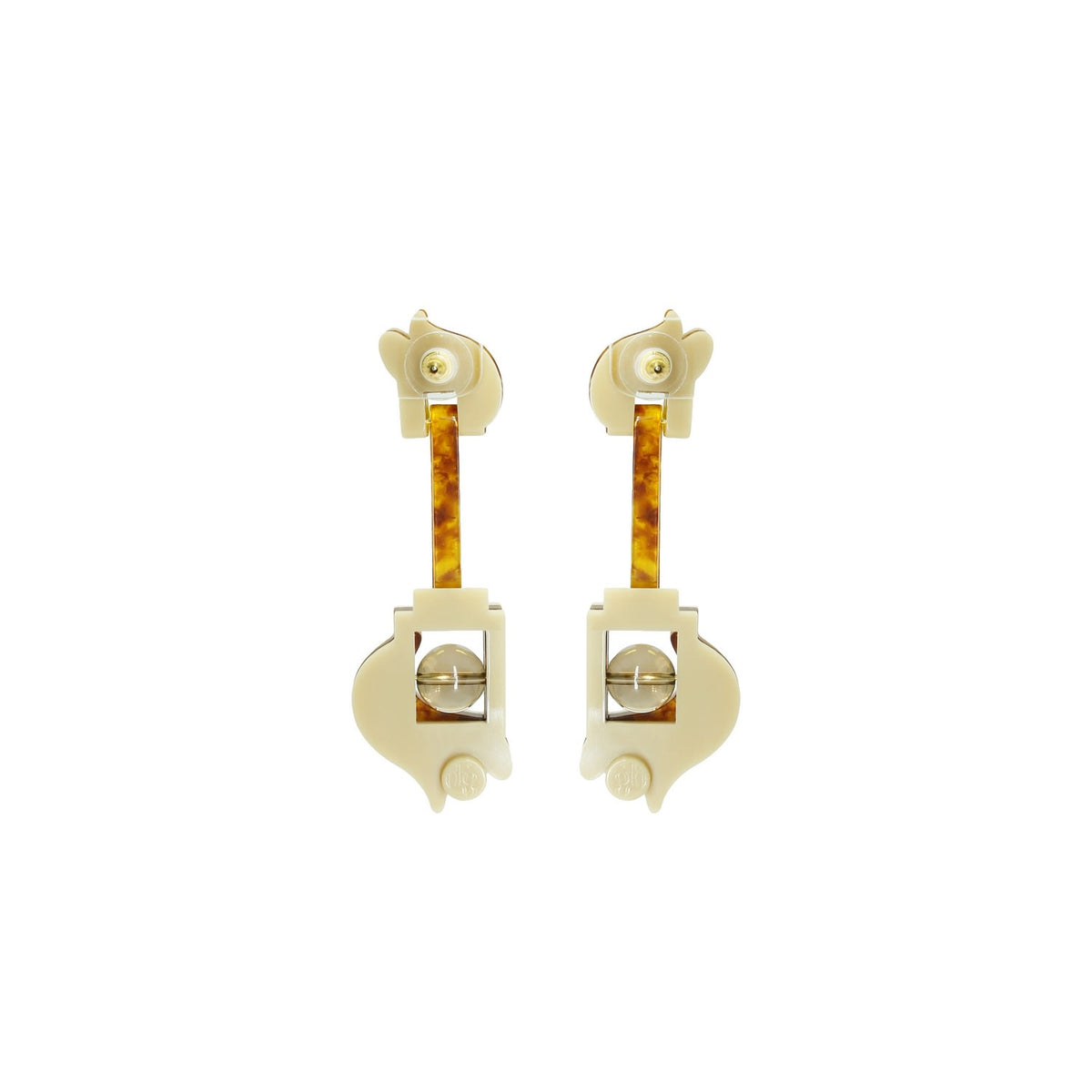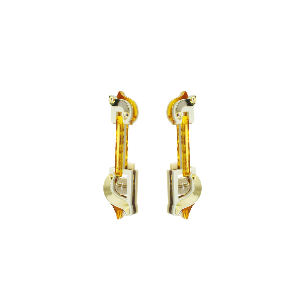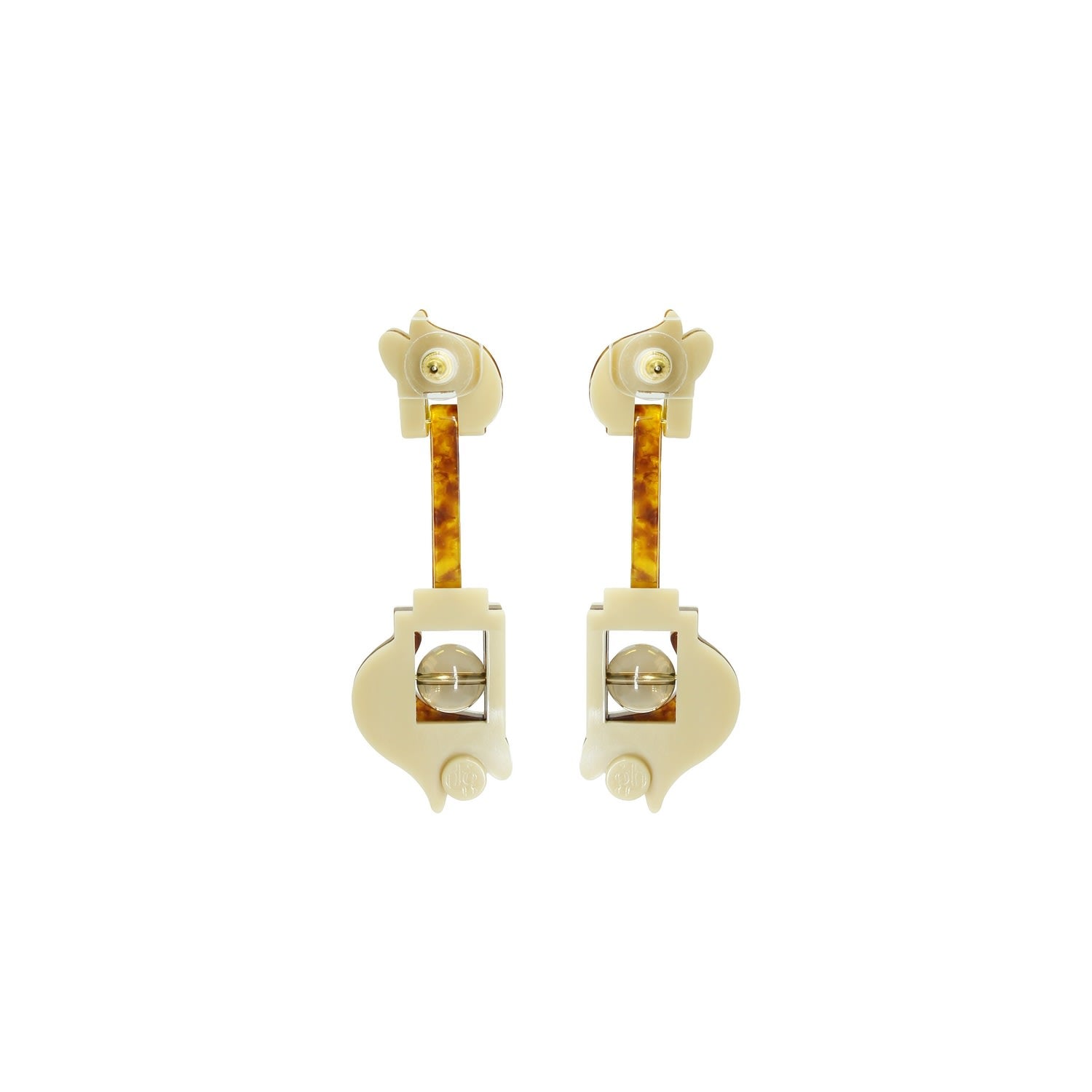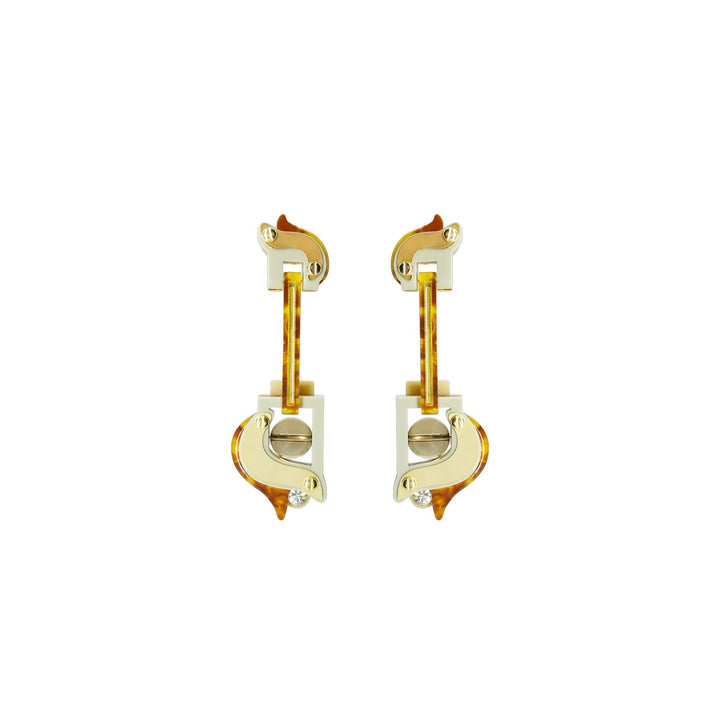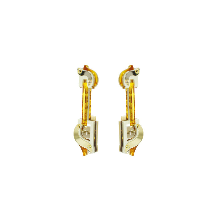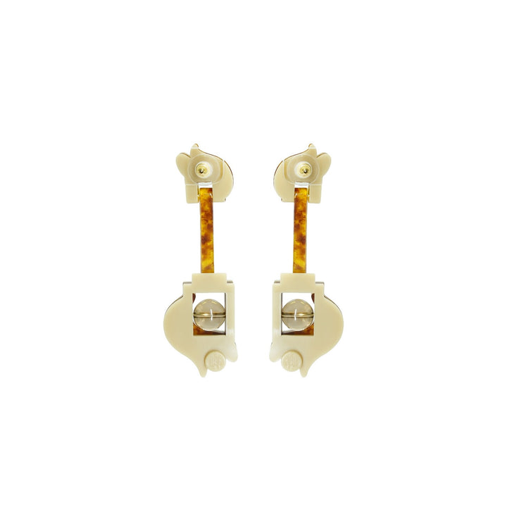 These handmade dangle earrings are crafted from acrylic with a chain, filigree application, and a volcanic lava bead. They have a brass pin, and the metals have a golden finish. Small variations in color and finish are expected. Use a dry cloth for cleaning and avoid contact with alcohol and perfumes.