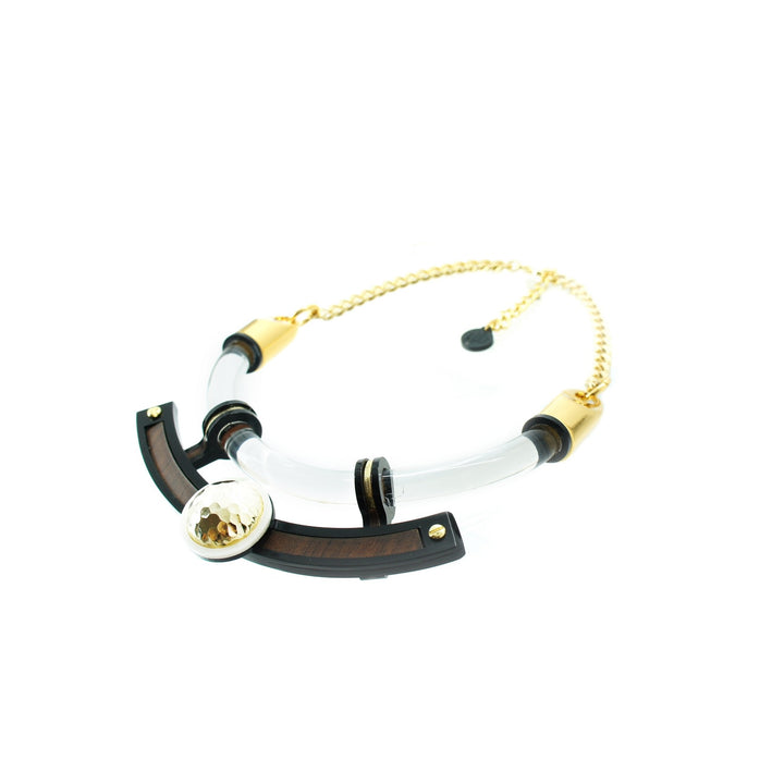 This handmade choker necklace is crafted from acrylic with a brass decoration, a Rosewood-colored Formica application, and zamak metal on the tips. The metals have a gold finish. Small variations in color and finish are expected. Use a dry cloth for cleaning and avoid contact with alcohol and perfumes.