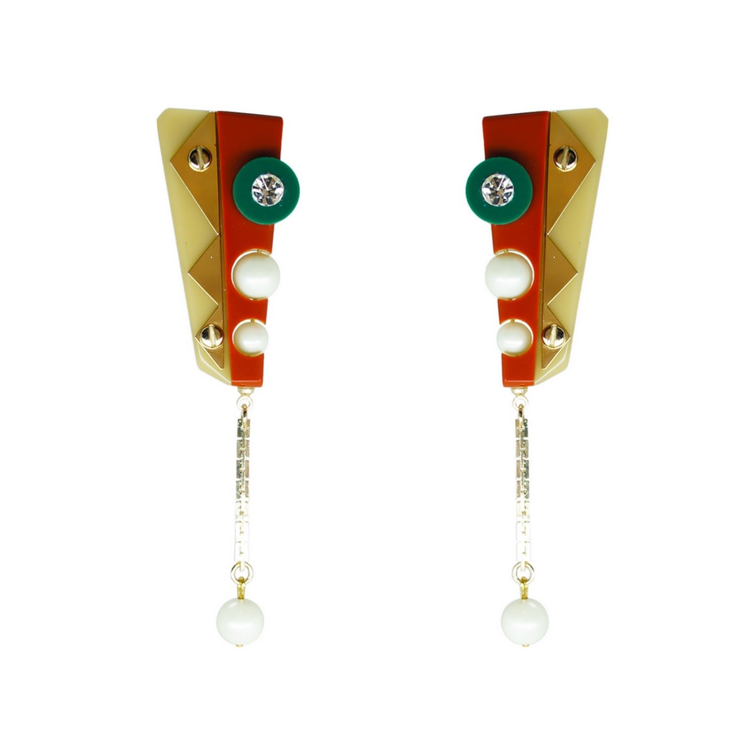 These handmade dangle earrings are crafted from acrylic with glass rhinestones, a shell pearl, a chain, and a pearl. The metals have a gold finish. Small variations in color and finish are expected. Use a dry cotton cloth for cleaning and avoid contact with alcohol and perfumes.