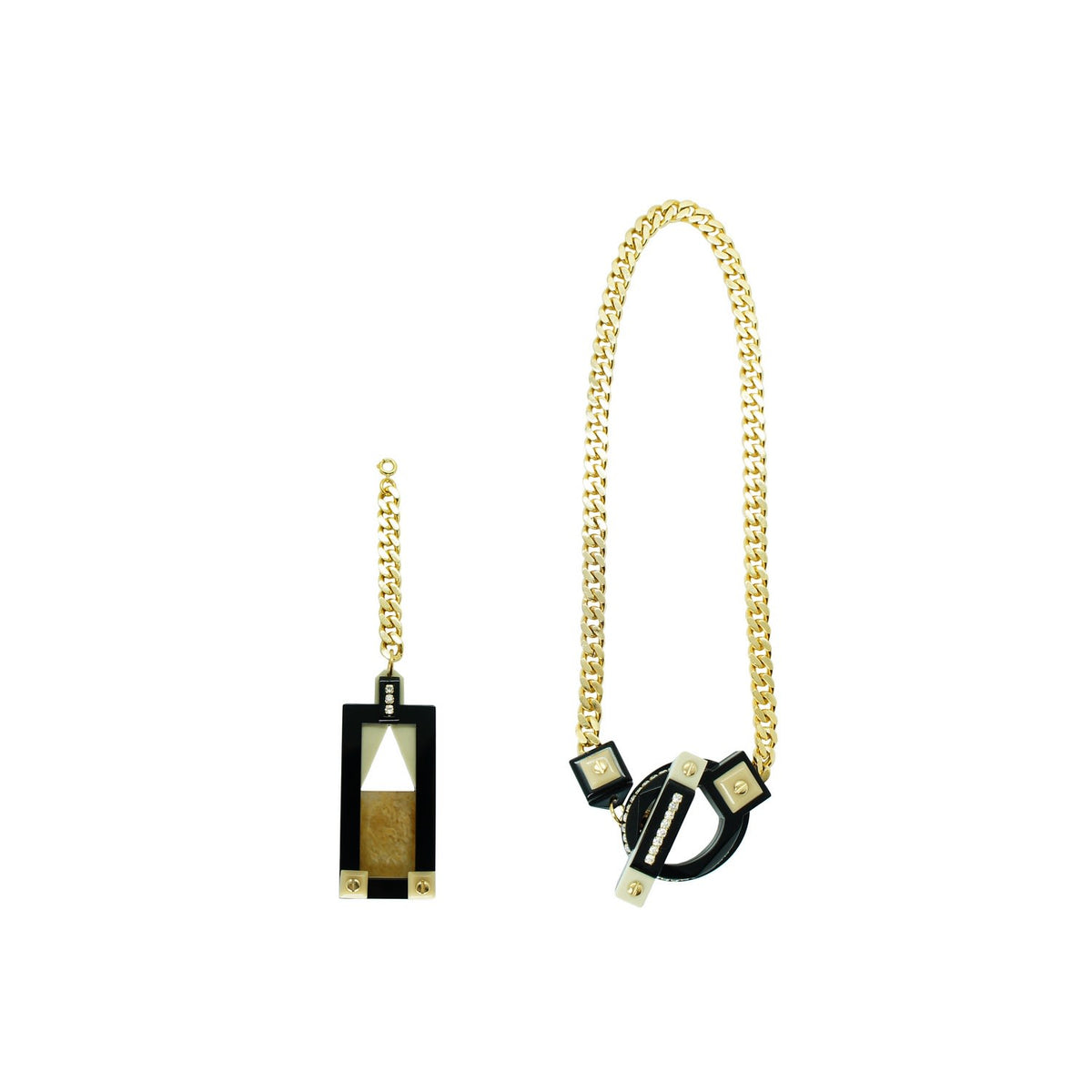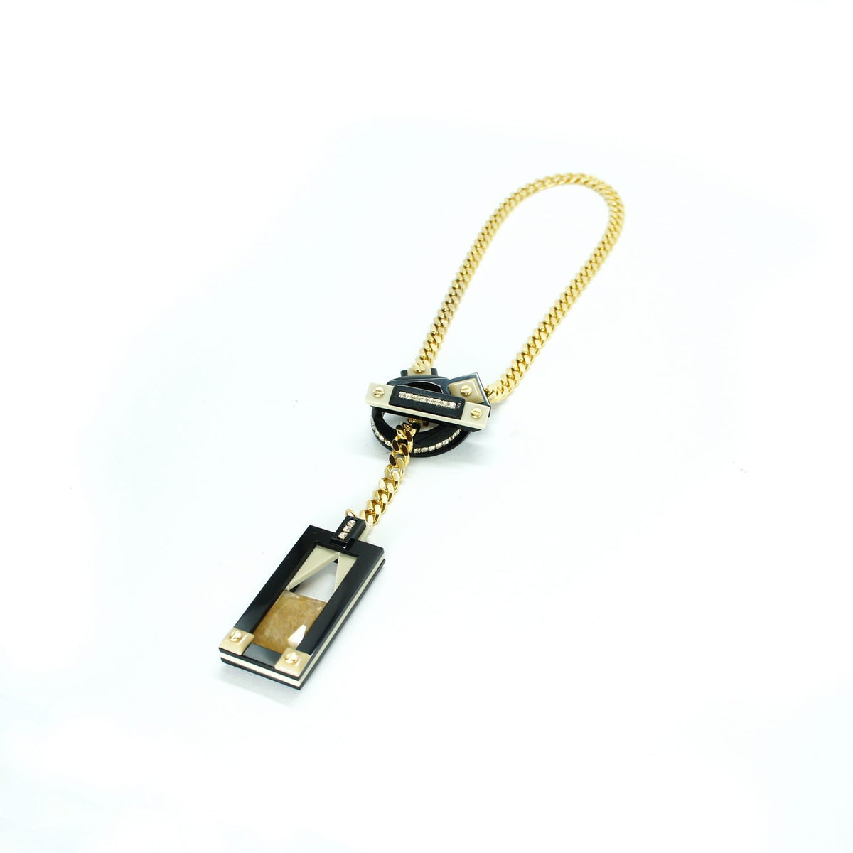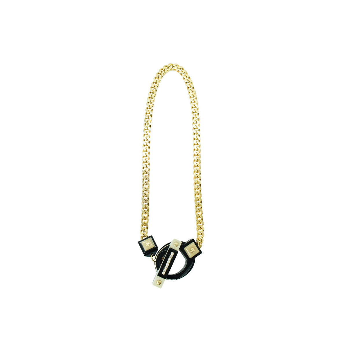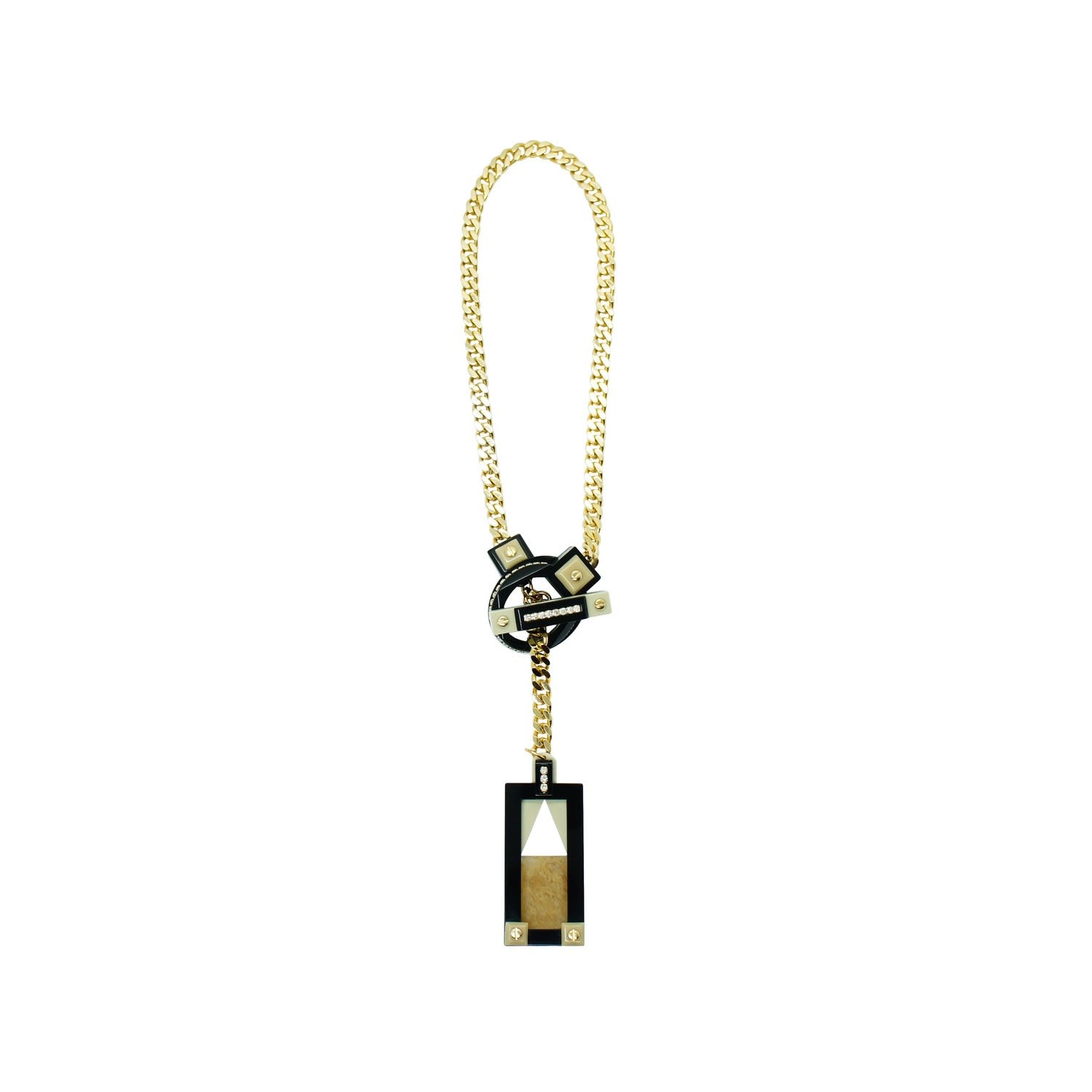 This handmade chain necklace is crafted from acrylic with glass rhinestones and a glass stone. The chains have a golden finish. Small variations in color and finish are expected. Use a dry cloth for cleaning and avoid contact with alcohol and perfumes.