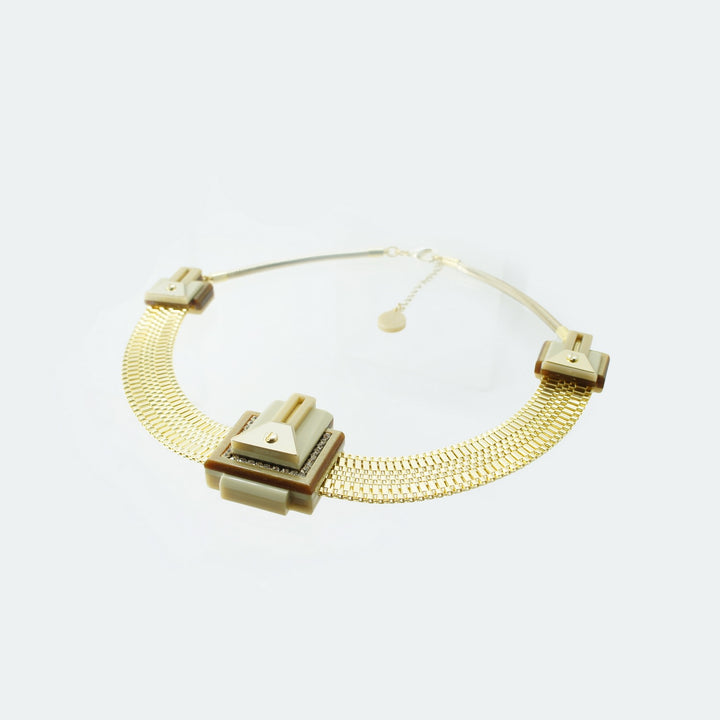 The Necklace Trapezes Clay by Gissa Bicalho is a unique and artistic accessory. This choker necklace is made of acrylic with an application of glass rhinestones and filigree. It has a lobster clasp with an extender. Its handcrafted nature ensures that each piece is slightly unique, adding a personal and one-of-a-kind touch to your style.