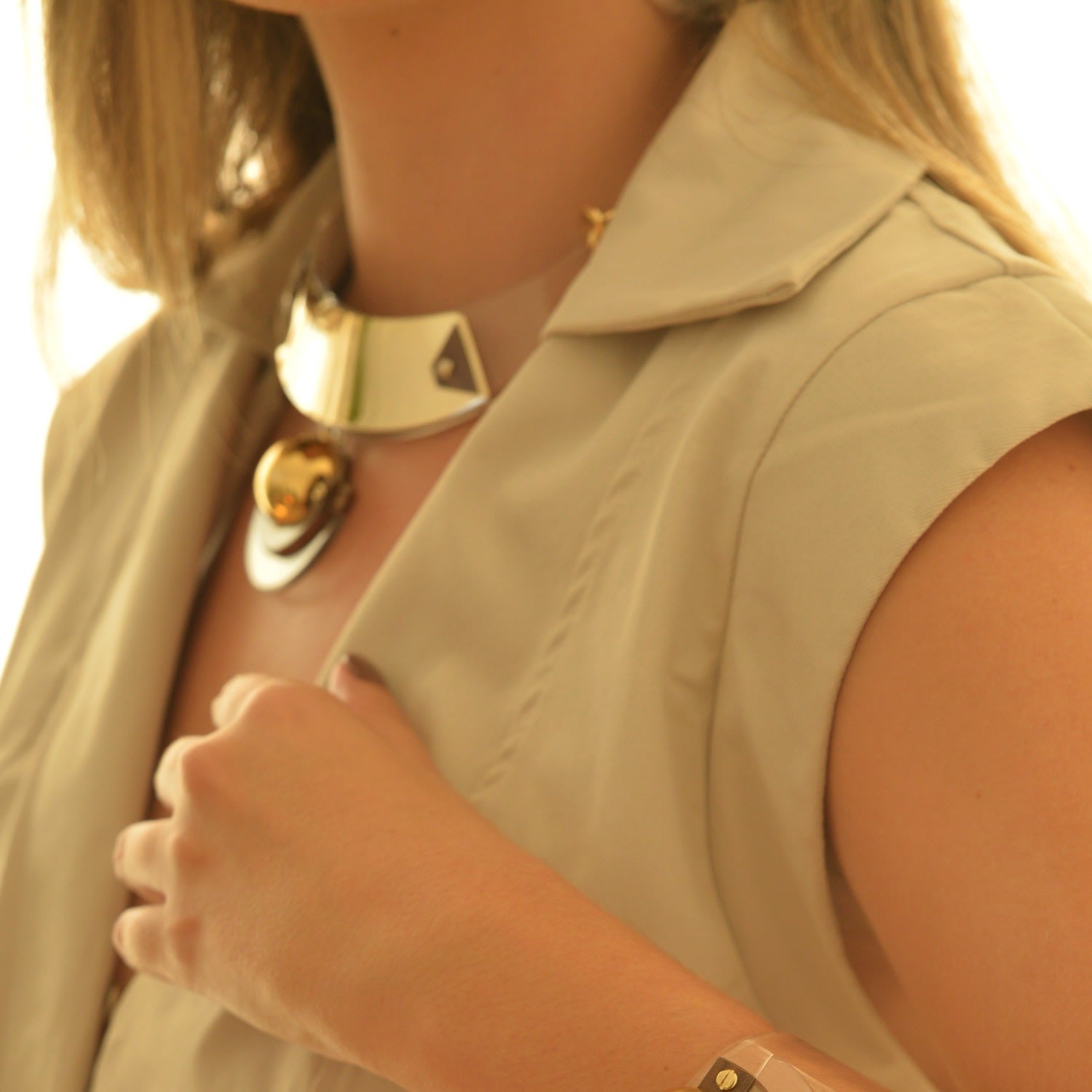 The Necklace Choker Pupile Crystal by Gissa Bicalho is a unique and artistic accessory. This choker necklace is made of acrylic with a Formica application. It also features a brass plate and a Zamak ball ornament. Its handcrafted nature ensures that each piece is slightly unique, adding a personal and one-of-a-kind touch to your style.