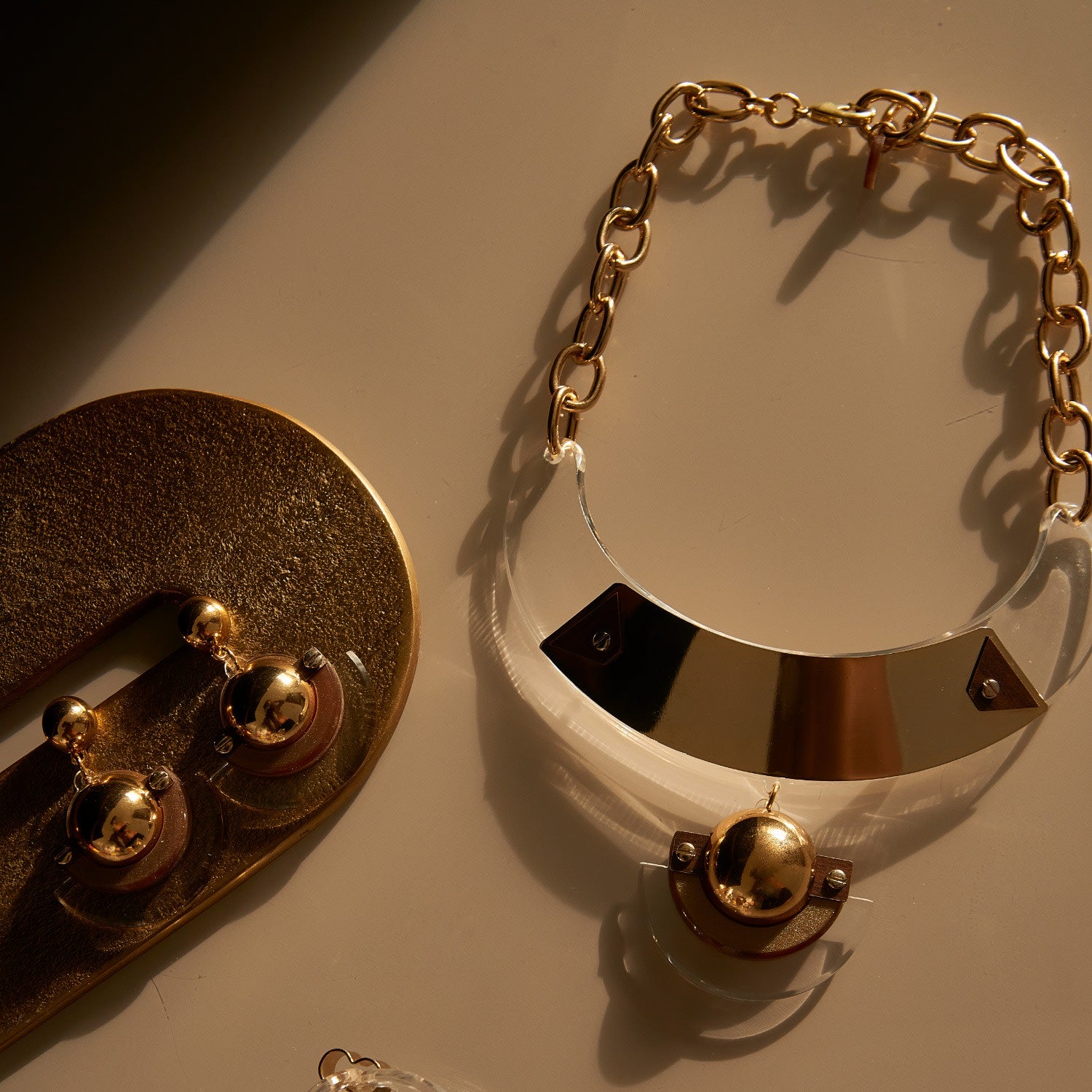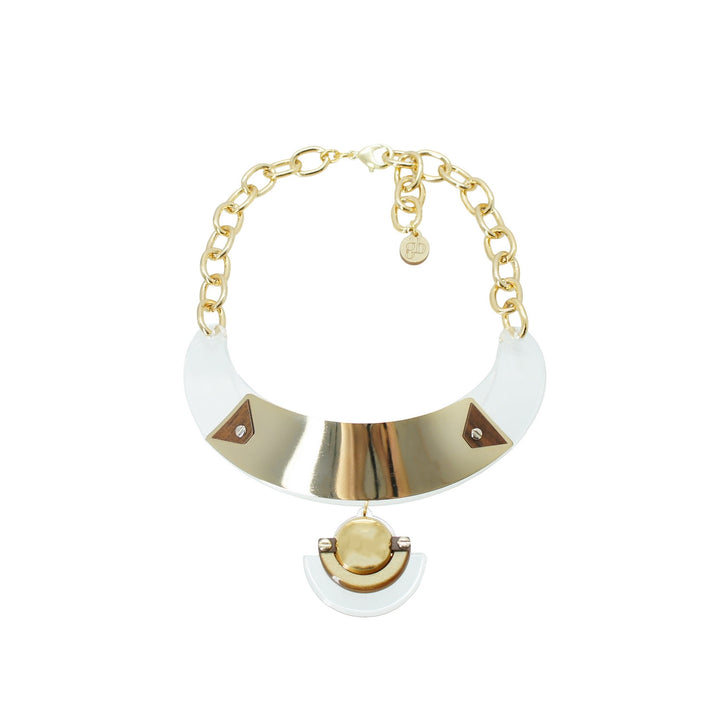 This handmade choker necklace is crafted from acrylic with a Formica application, a brass plate, and a Zamak ball ornament. The chains and metals have a gold finish. Small variations in color and finish are expected. Use a dry cloth for cleaning and avoid contact with alcohol and perfumes.