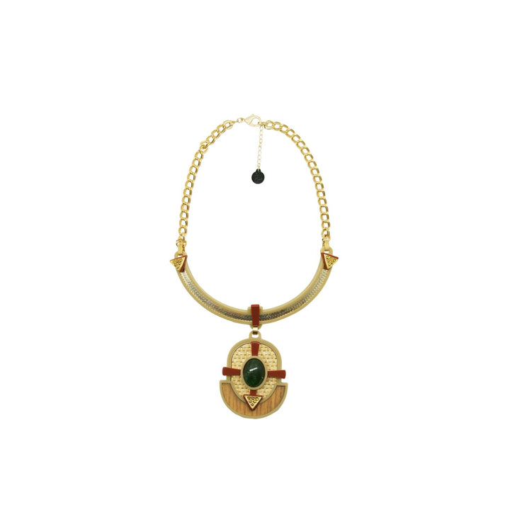 This handmade pendant necklace is crafted from acrylic with a synthetic stone, Formica, and raffia straw application. It also features glass rhinestones and zamak decorations. The metals have a gold finish. Small variations in color and finish are expected. Use a dry cloth for cleaning and avoid contact with alcohol and perfumes.