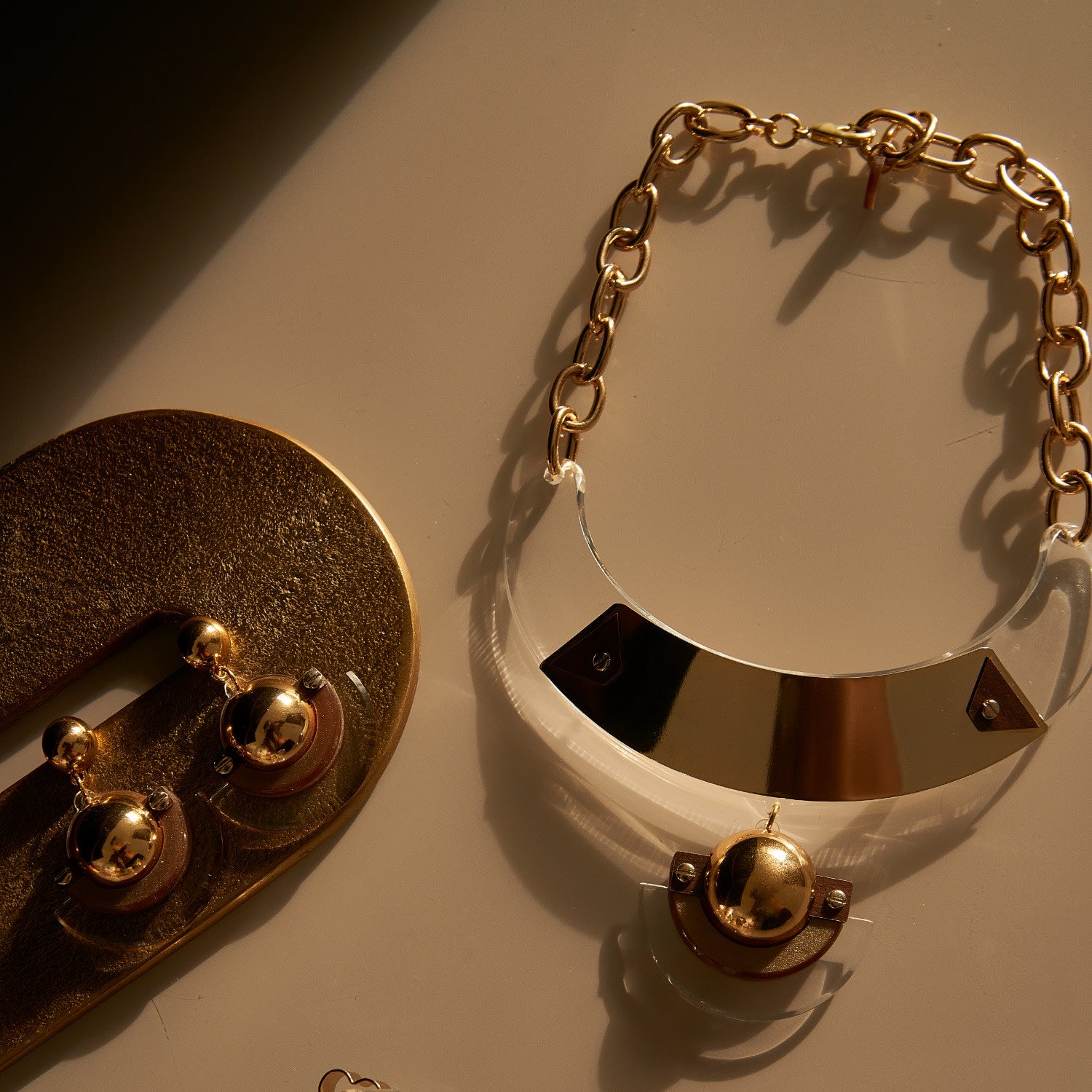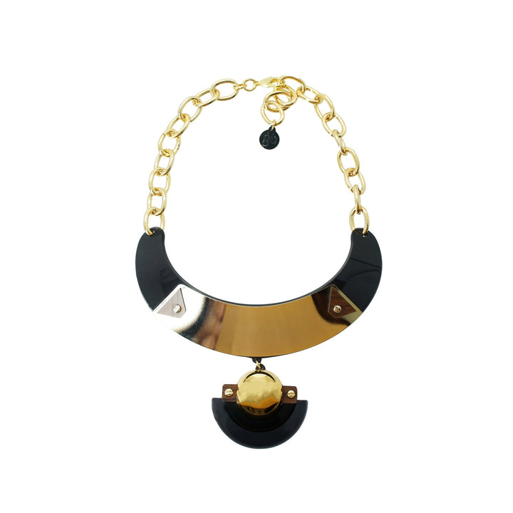This handmade choker necklace is crafted from acrylic with a Formica application, a brass plate, and a Zamak ball ornament. The chains and metals have a gold finish. Small variations in color and finish are expected. Use a dry cloth for cleaning and avoid contact with alcohol and perfumes.