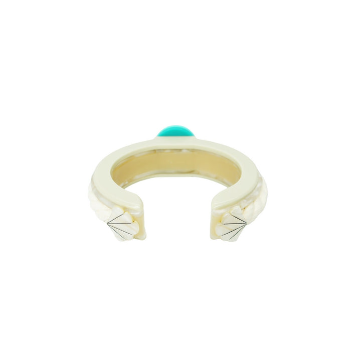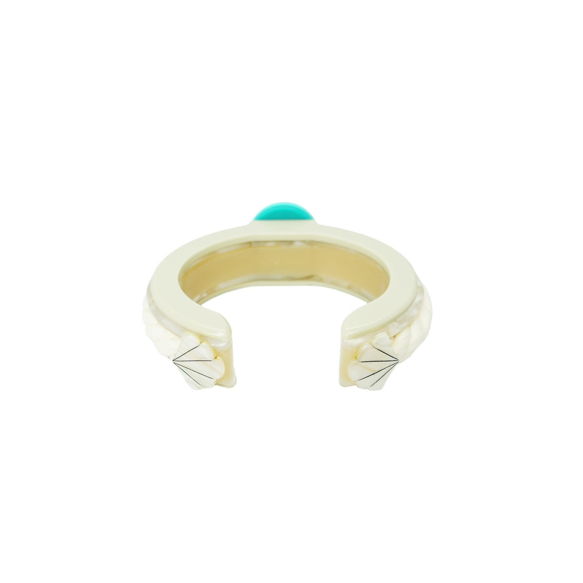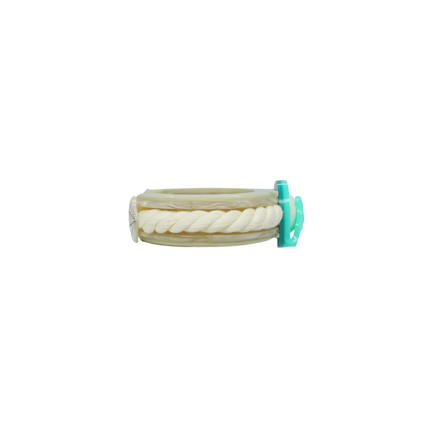 This Handmade Bracelet Coral And Pearl Cord Turquoise Green by Gissa Bicalho is a vibrant and artistic piece. The cuff model features a beautiful coral and pearl braided cotton cord with glass rhinestones, creating a unique texture and color combination. This handmade bracelet adds a touch of bohemian flair and personality to any ensemble.