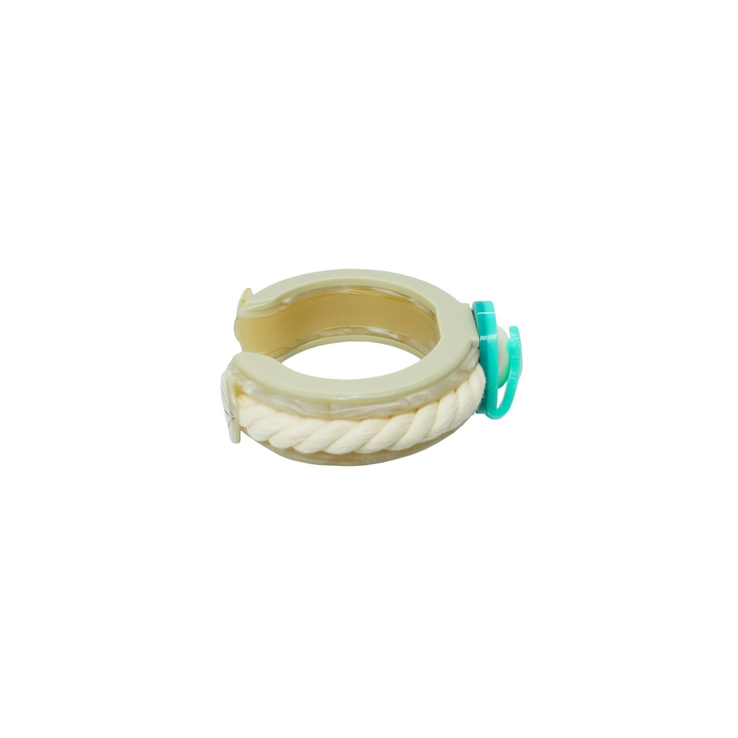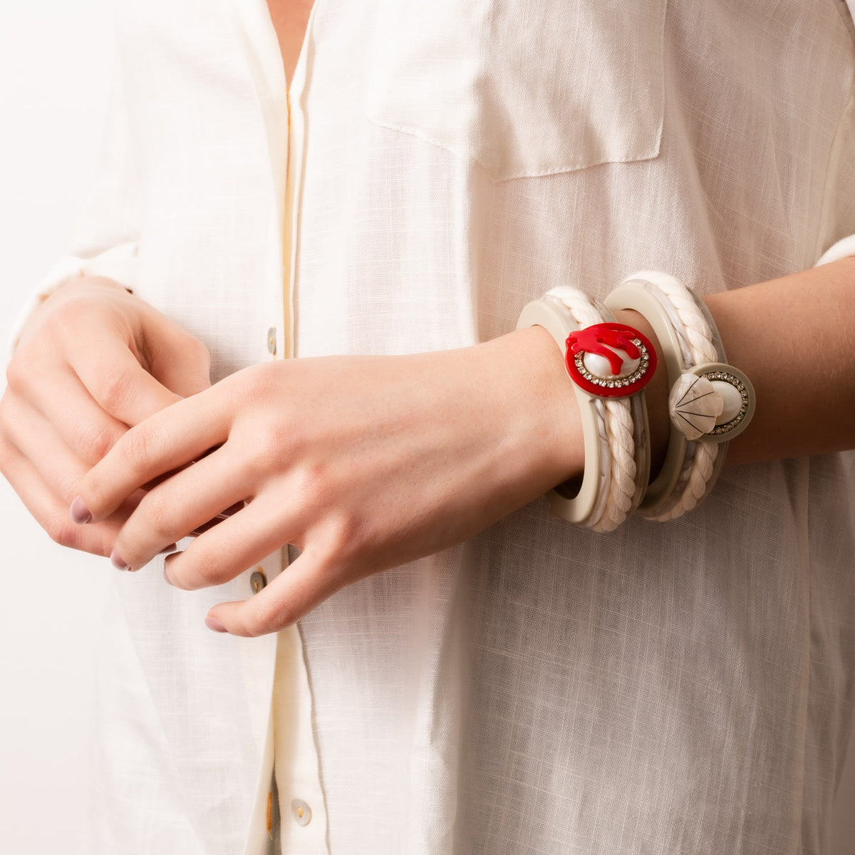 This is a cuff bracelet made from acrylic with glass rhinestones and a braided cotton cord. It is available in sizes XS, S, M, and L.