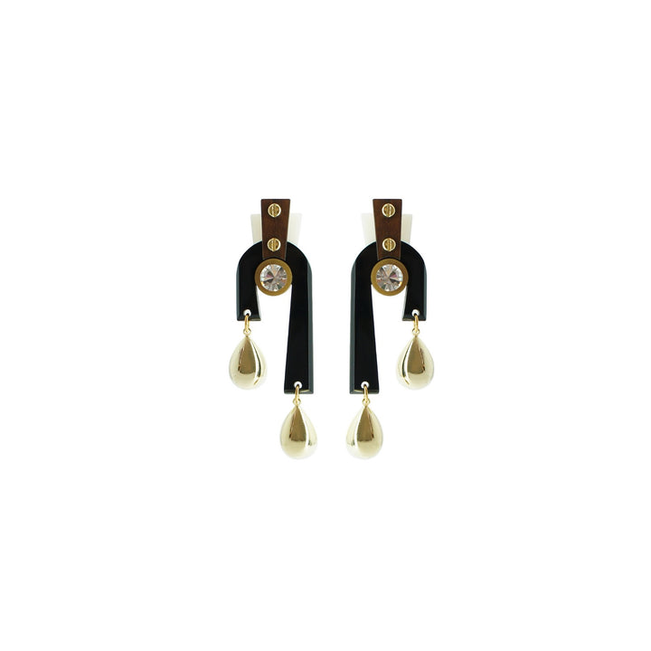 These Earring Libra Deco Black by Gissa Bicalho are a captivating pair of dangle earrings that combine various materials to create a unique and artistic look. The mix of acrylic, formica, and brass gives them a distinctive texture and a sophisticated, modern feel, making them a perfect statement piece.
