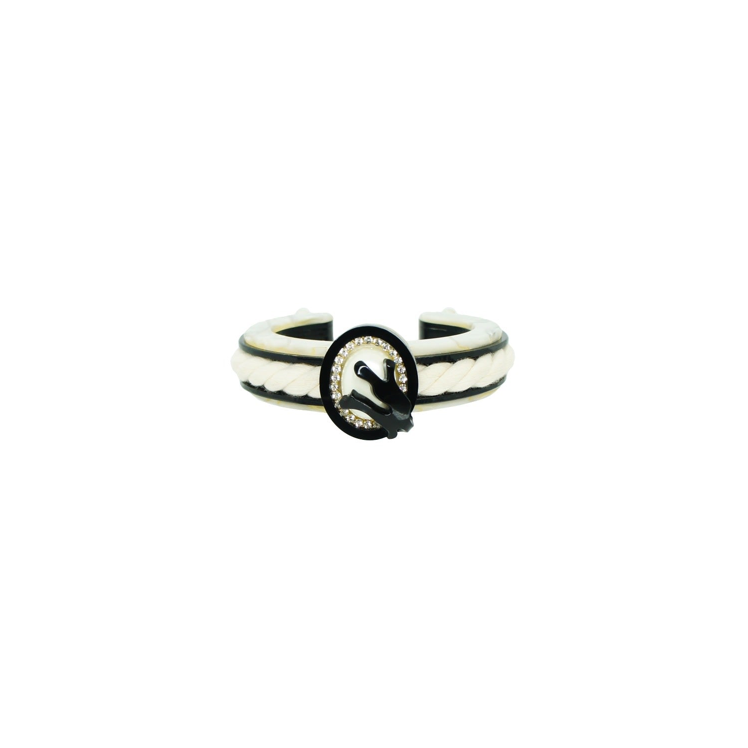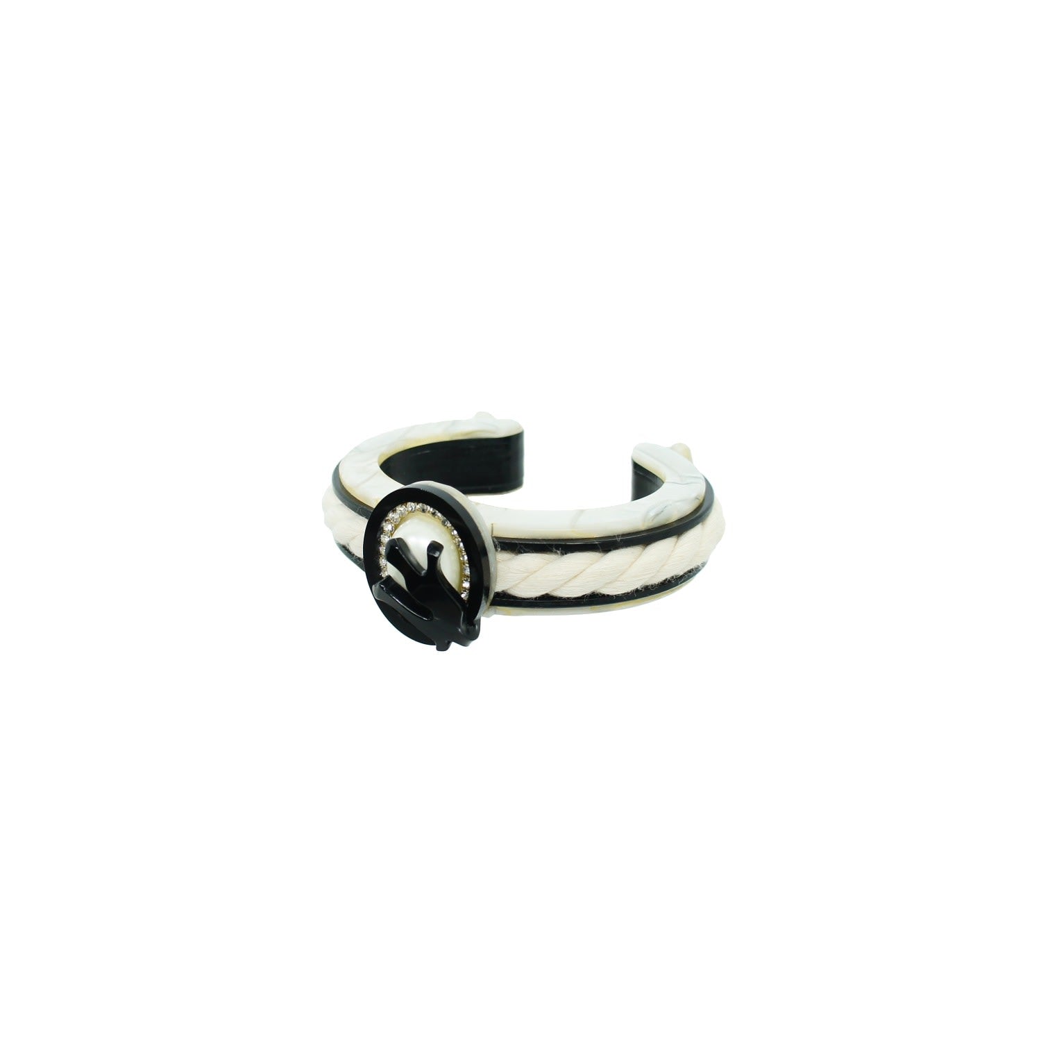 This cuff bracelet is made from acrylic with glass rhinestones and a braided cotton cord. It is available in sizes XS, S, M, and L.
