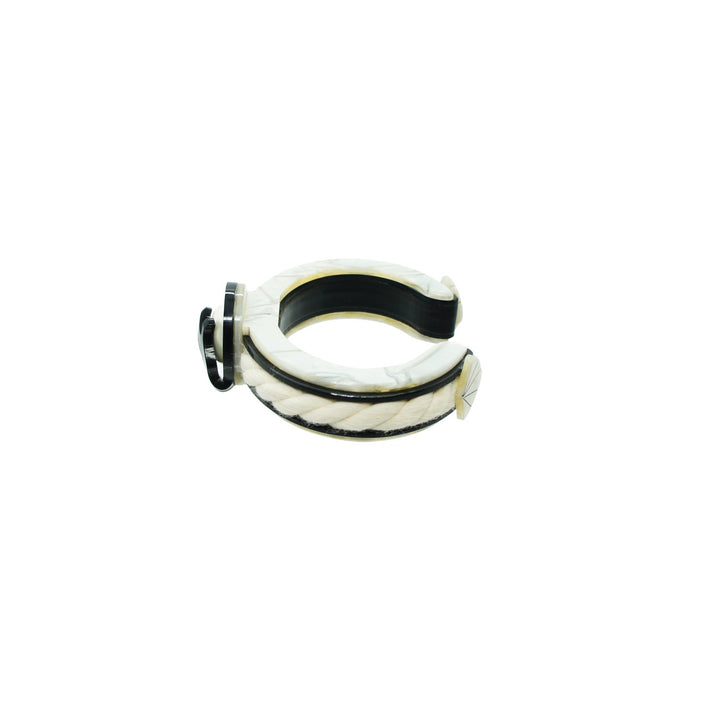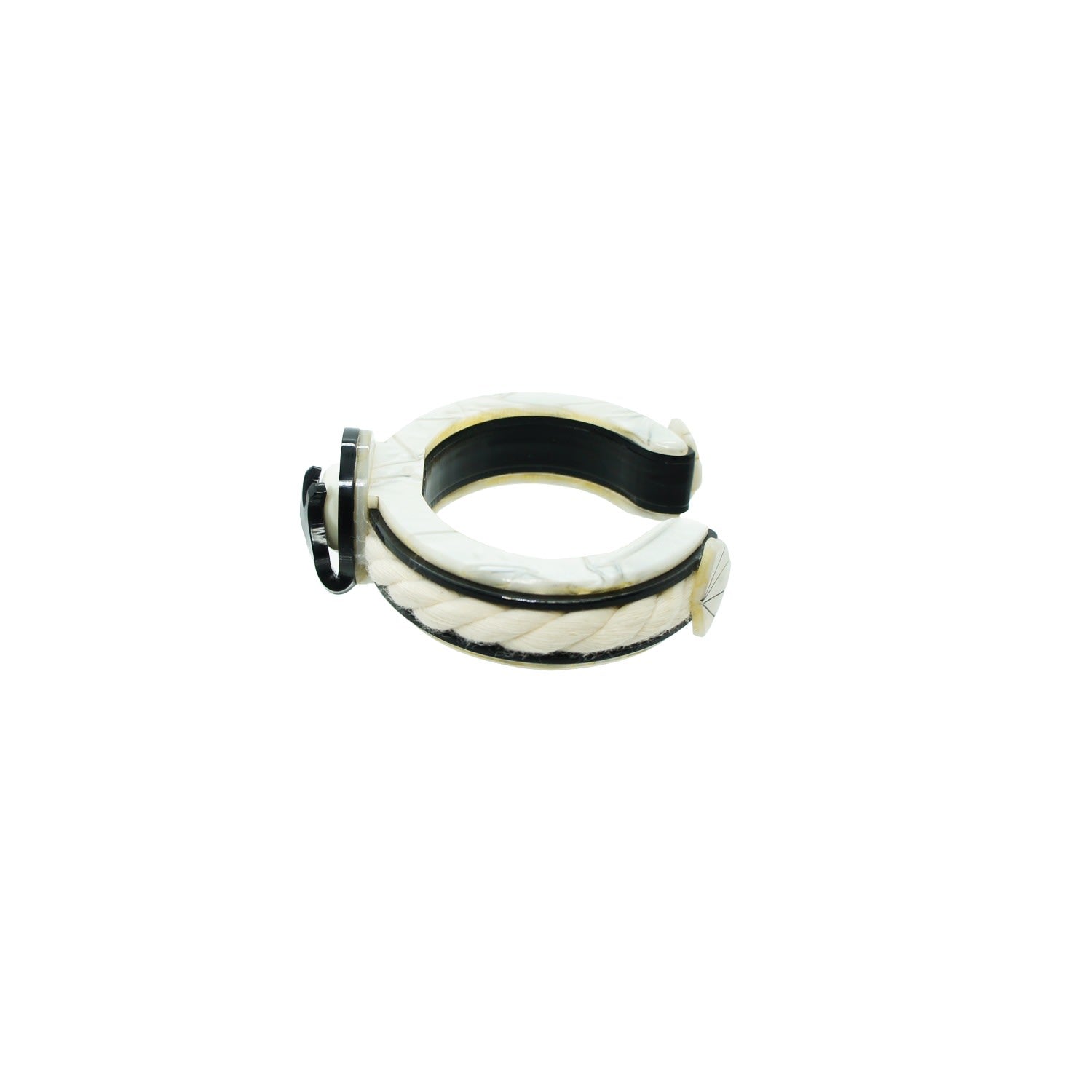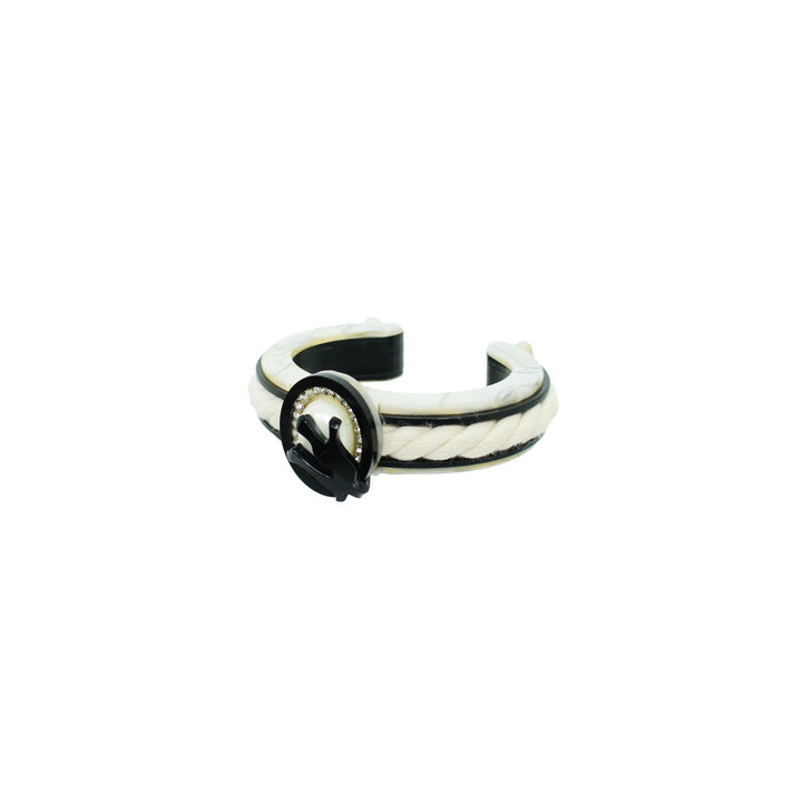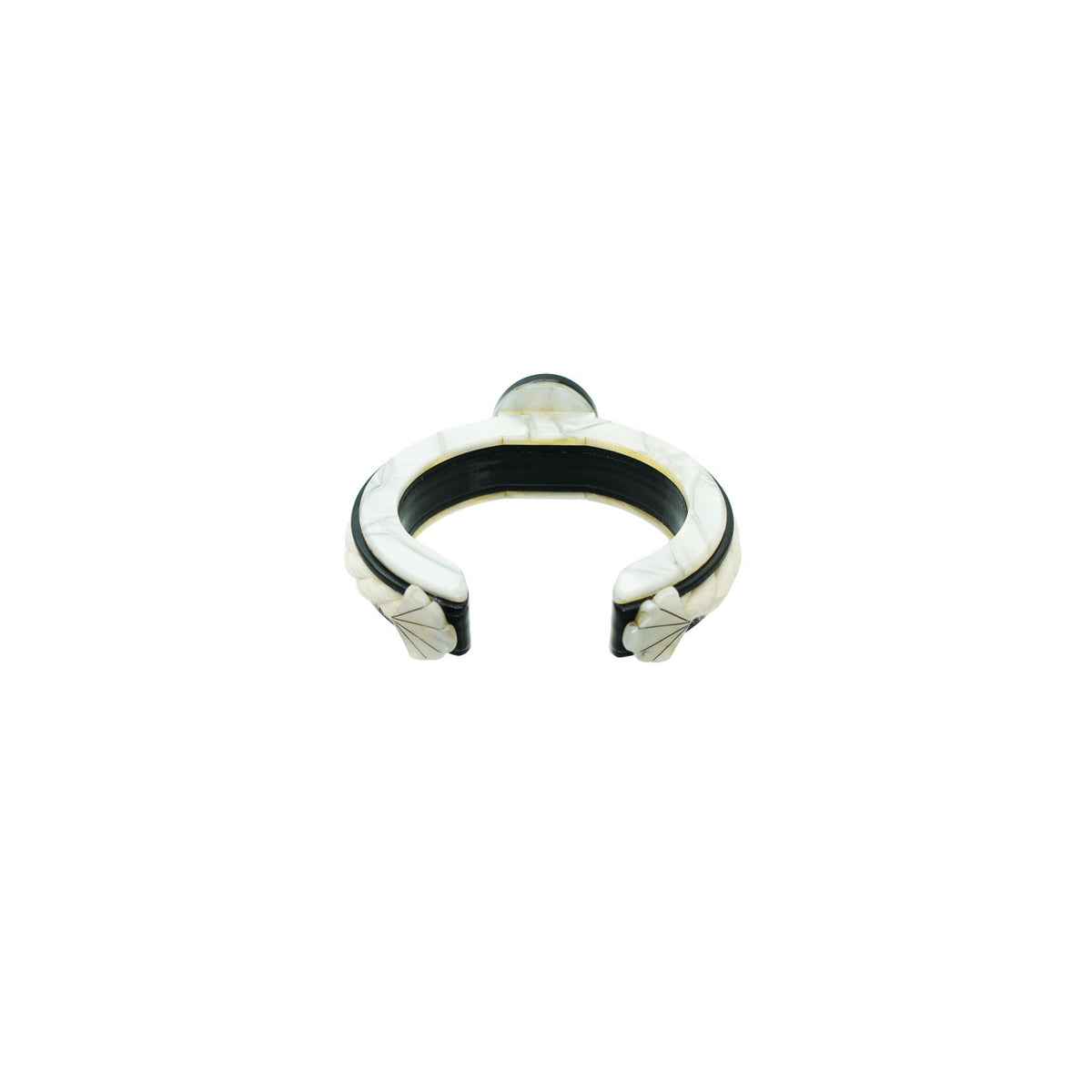 This Acrylic Handmade Bracelet Coral And Pearl Cord Black by Gissa Bicalho is a unique and artistic cuff bracelet. Its design features a beautiful black braided cotton cord and glass rhinestones, creating a sophisticated and eye-catching piece. Handmade by Brazilian artisans, each bracelet is slightly unique due to its handcrafted nature.