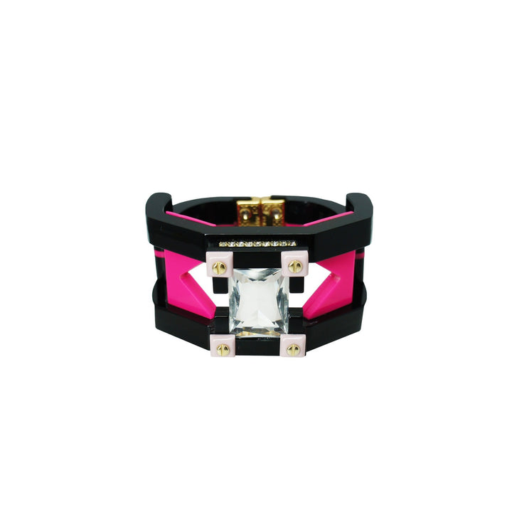 This Handmade Acrylic Bracelet Deco Rectangular Shaped Stone Pink by Gissa Bicalho is an artistic and captivating piece. The articulated design features a beautiful rectangular pink glass stone and glass rhinestones, creating a sophisticated and modern look. Handmade by Brazilian artisans, each piece is slightly unique and a wearable work of art.