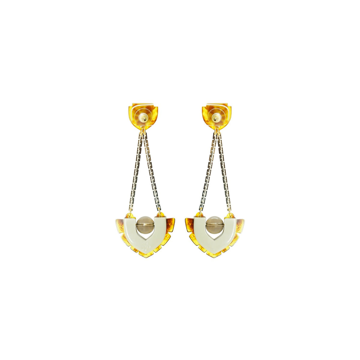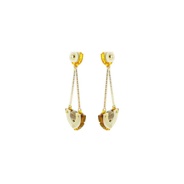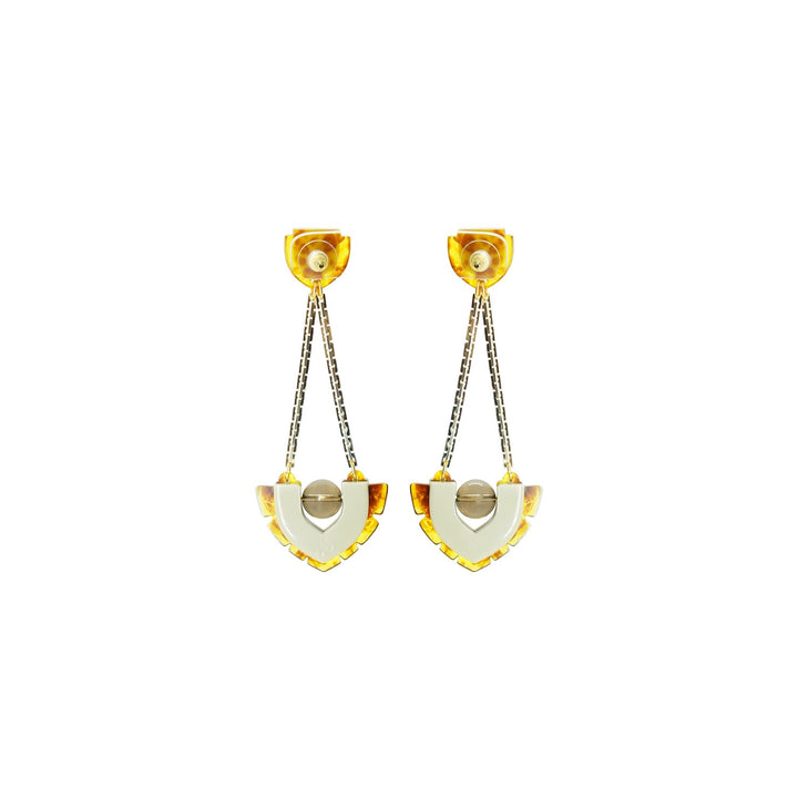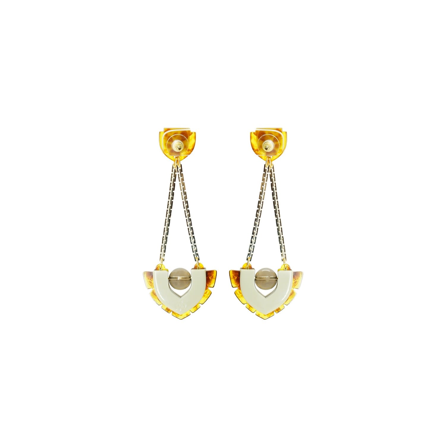These dangle earrings are made from acrylic with a brass pin. They feature a chain, glass rhinestone applications, a volcanic lava bead, filigree, and golden-finished metals.