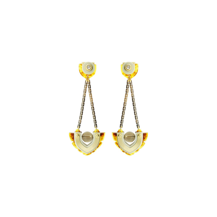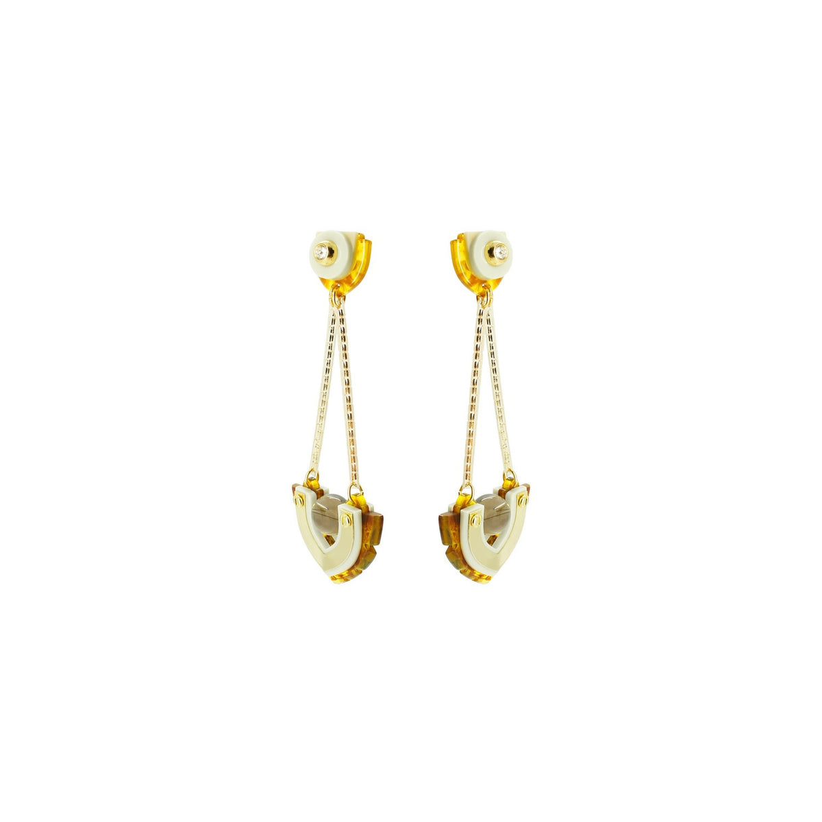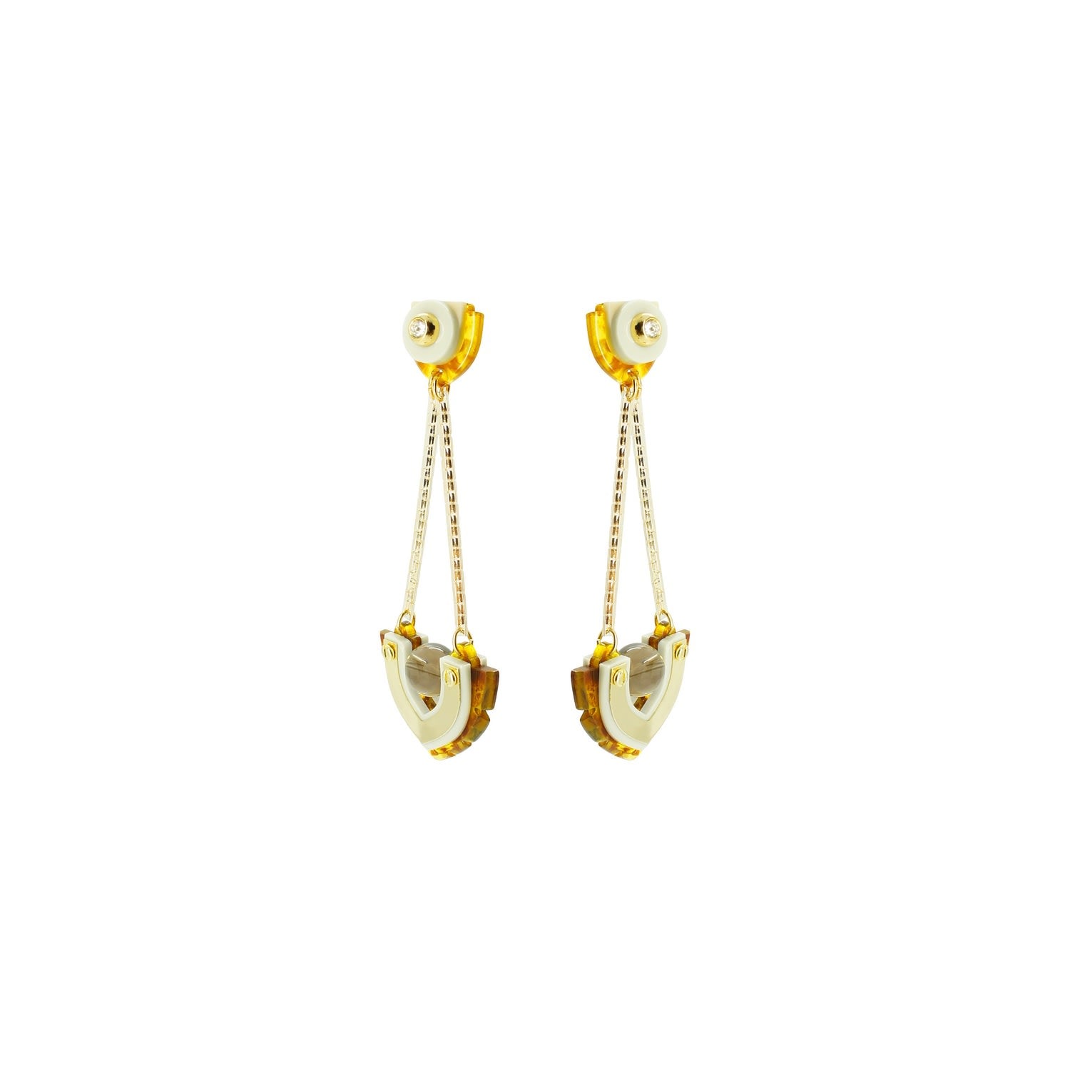These dangle earrings are made from acrylic with a brass pin. They feature a chain, glass rhinestone applications, a volcanic lava bead, filigree, and golden-finished metals.