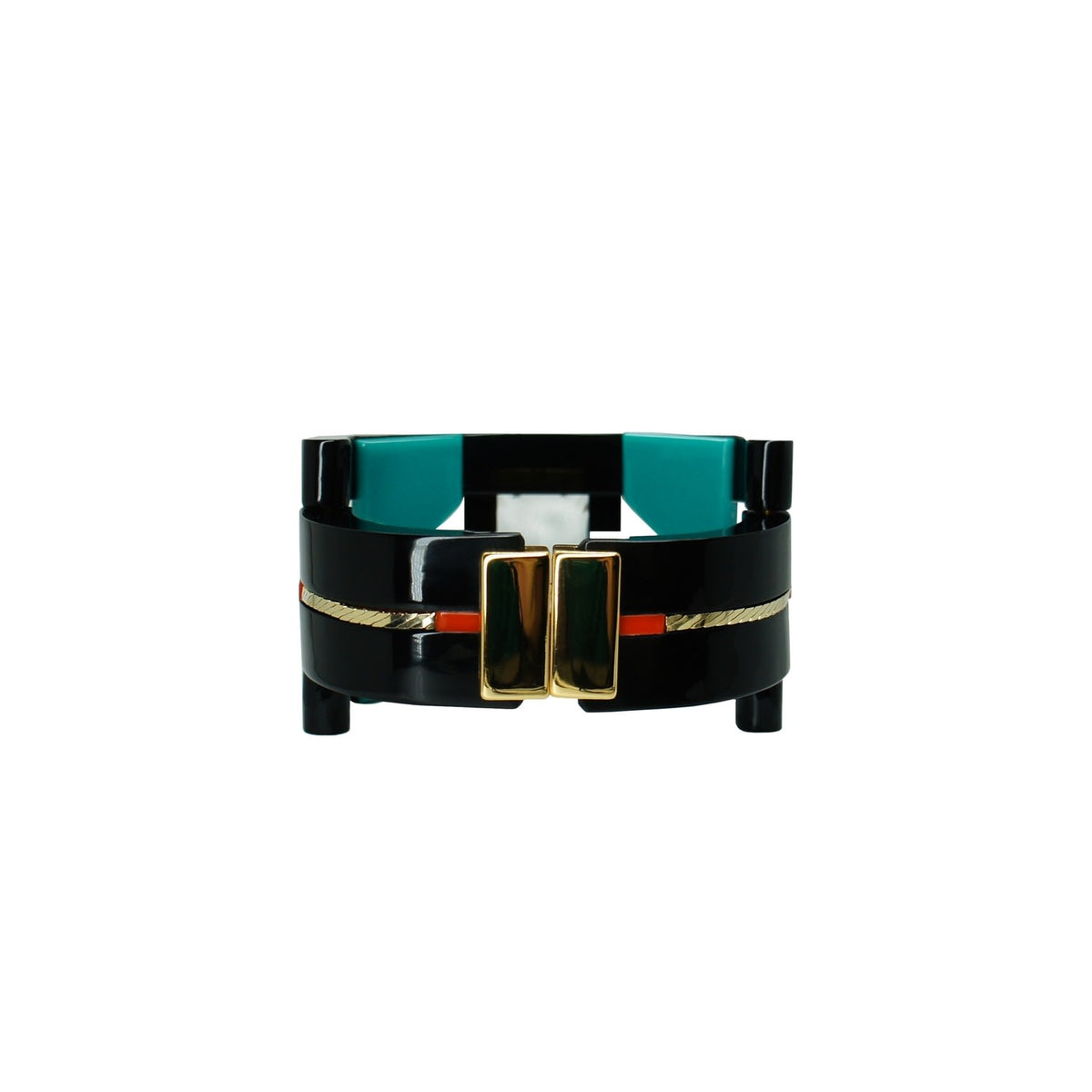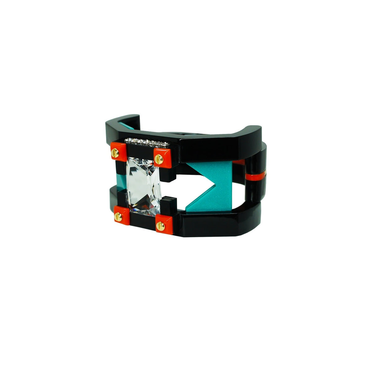 This Handmade Acrylic Bracelet Deco Rectangular Shaped Stone Turquoise by Gissa Bicalho is an artistic and captivating piece. The articulated design features a beautiful rectangular turquoise glass stone and glass rhinestones, creating a sophisticated and modern look. Handmade by Brazilian artisans, each piece is slightly unique and a wearable work of art.