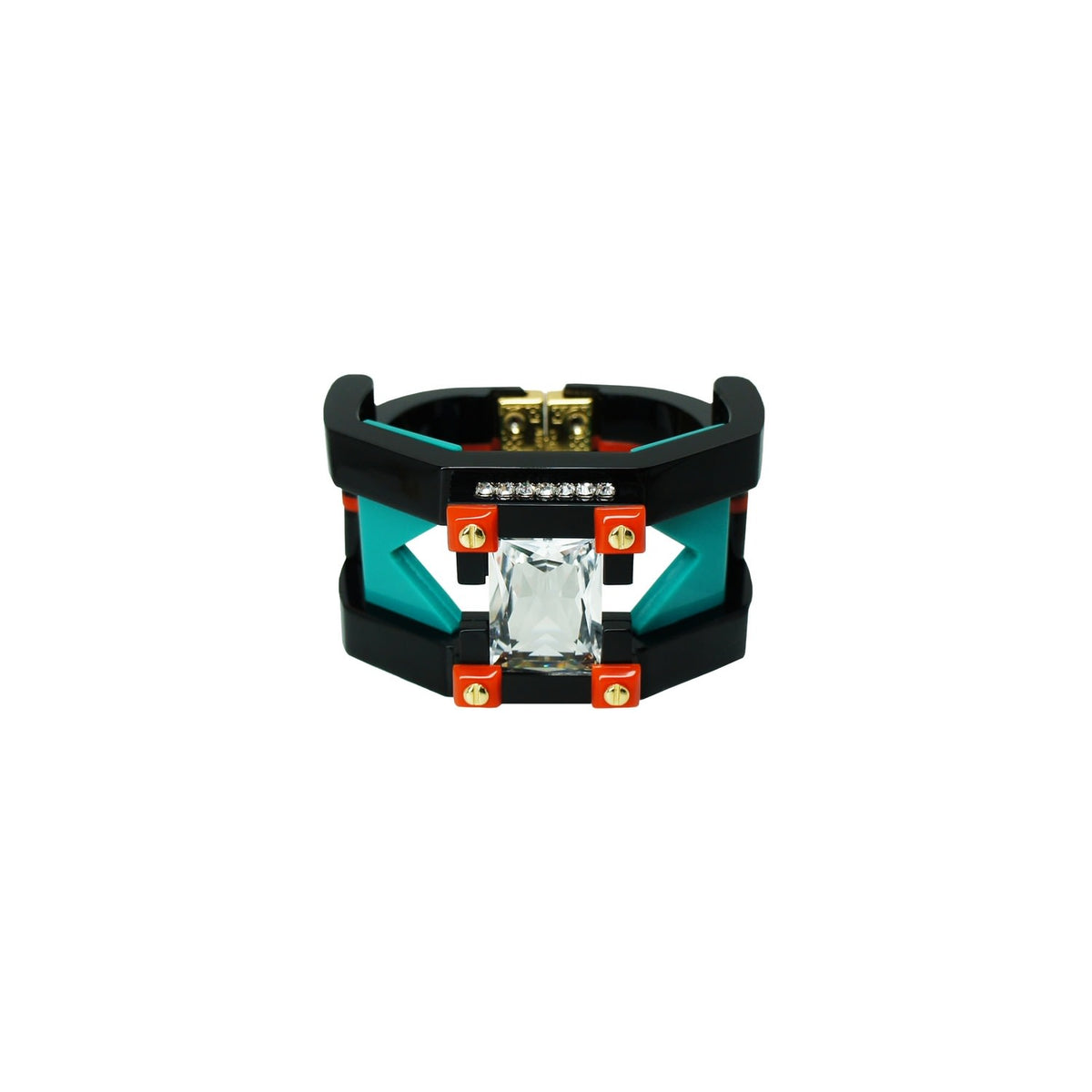 This articulated bangle is made from acrylic. It features glass rhinestones, a glass stone, and golden-finished metals with a magnetic clasp.