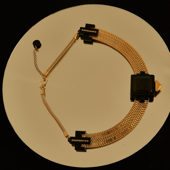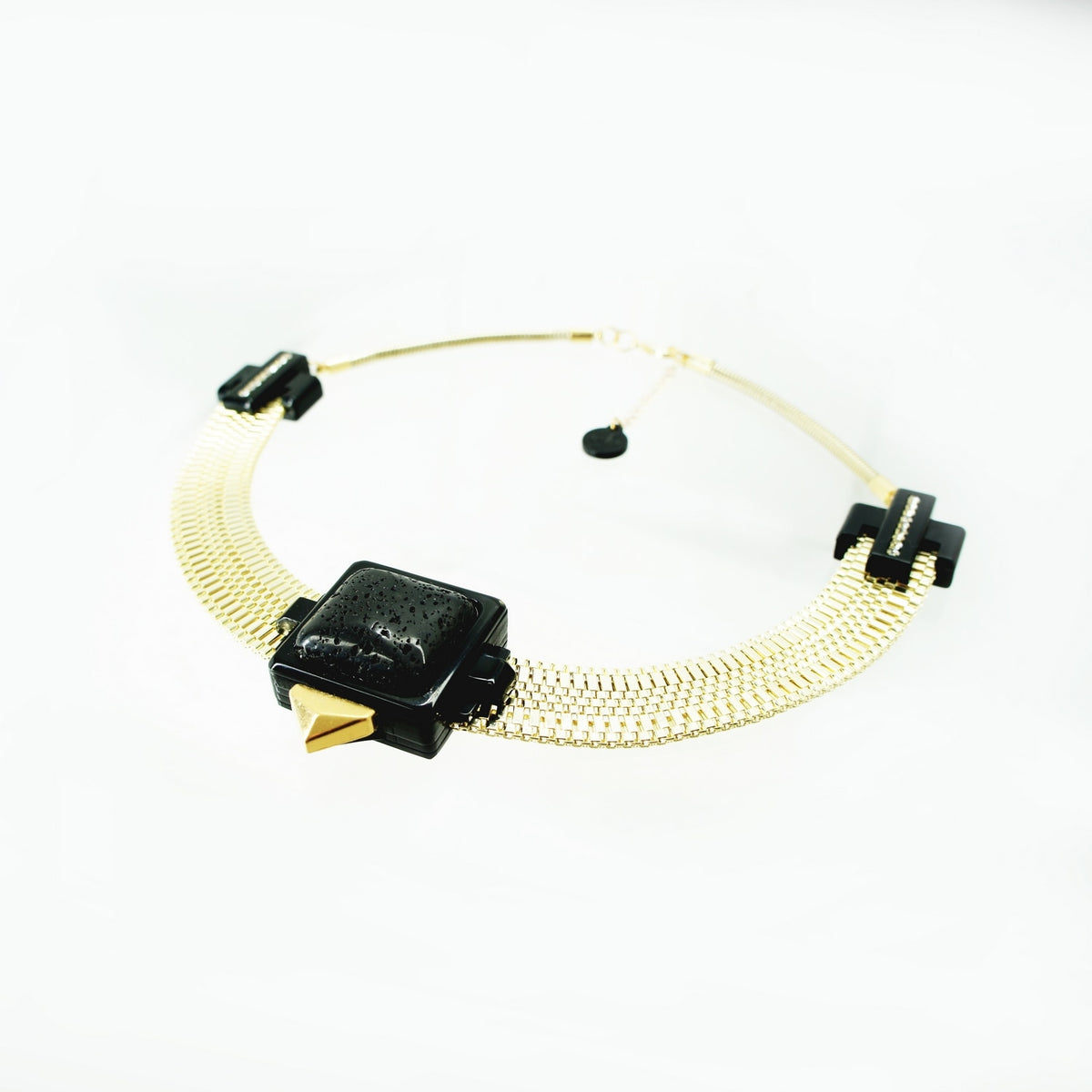 This choker necklace is made of acrylic. It features a square volcanic lava stone, a Zamak ornament, glass rhinestones, a lobster clasp, and an extender, with chains and metals in a golden finish.